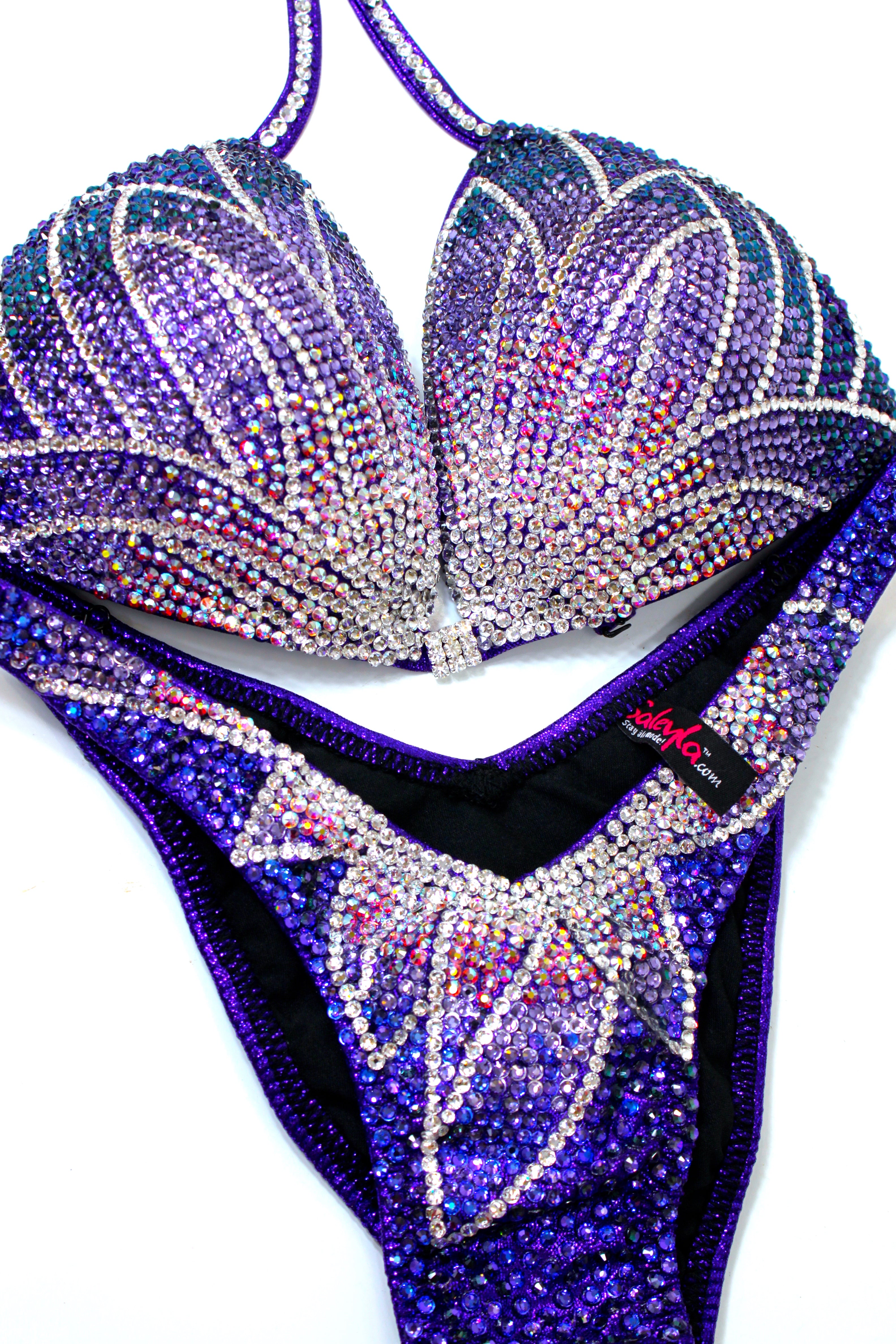 - Features: Rhinestone buckle at center bra, decorated with crystal clear, crystal AB, fuchsia AB, light purple & dark purple rhinestones, rio back coverage, fully lined