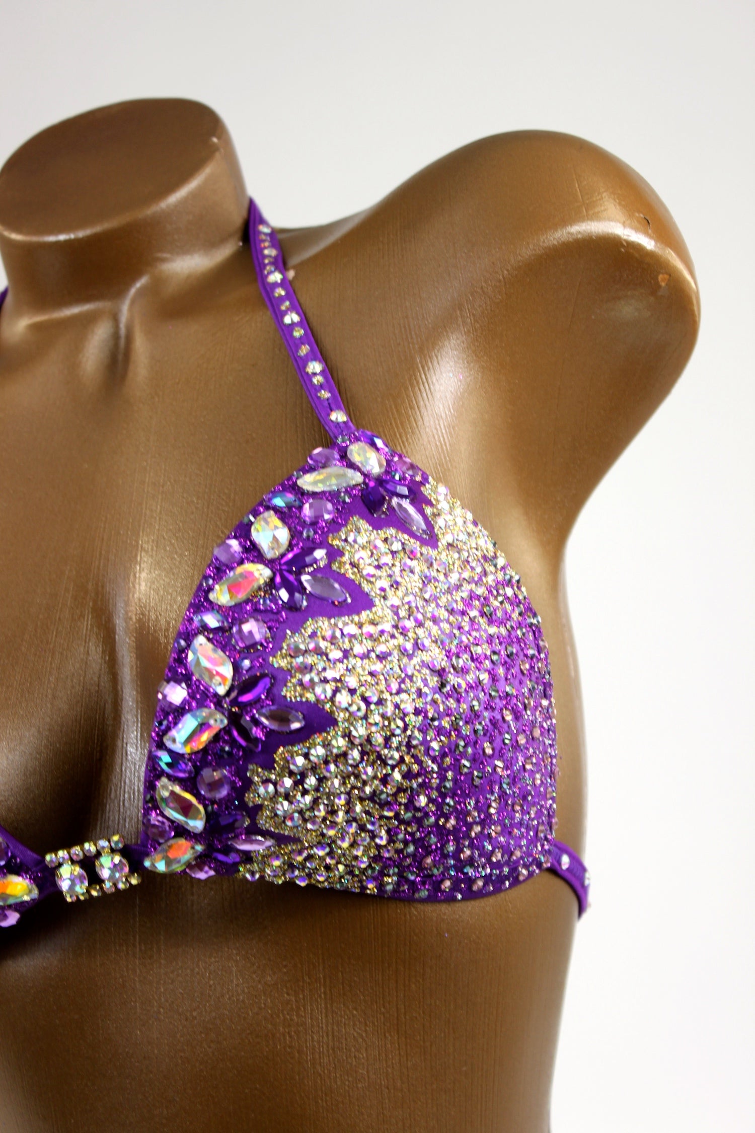 - Features: Rhinestone connector at center bra, decorated with crystal AB, purple & light amethyst rhinestones in various sizes, sparkling glitter detail, moderate back coverage, fully lined