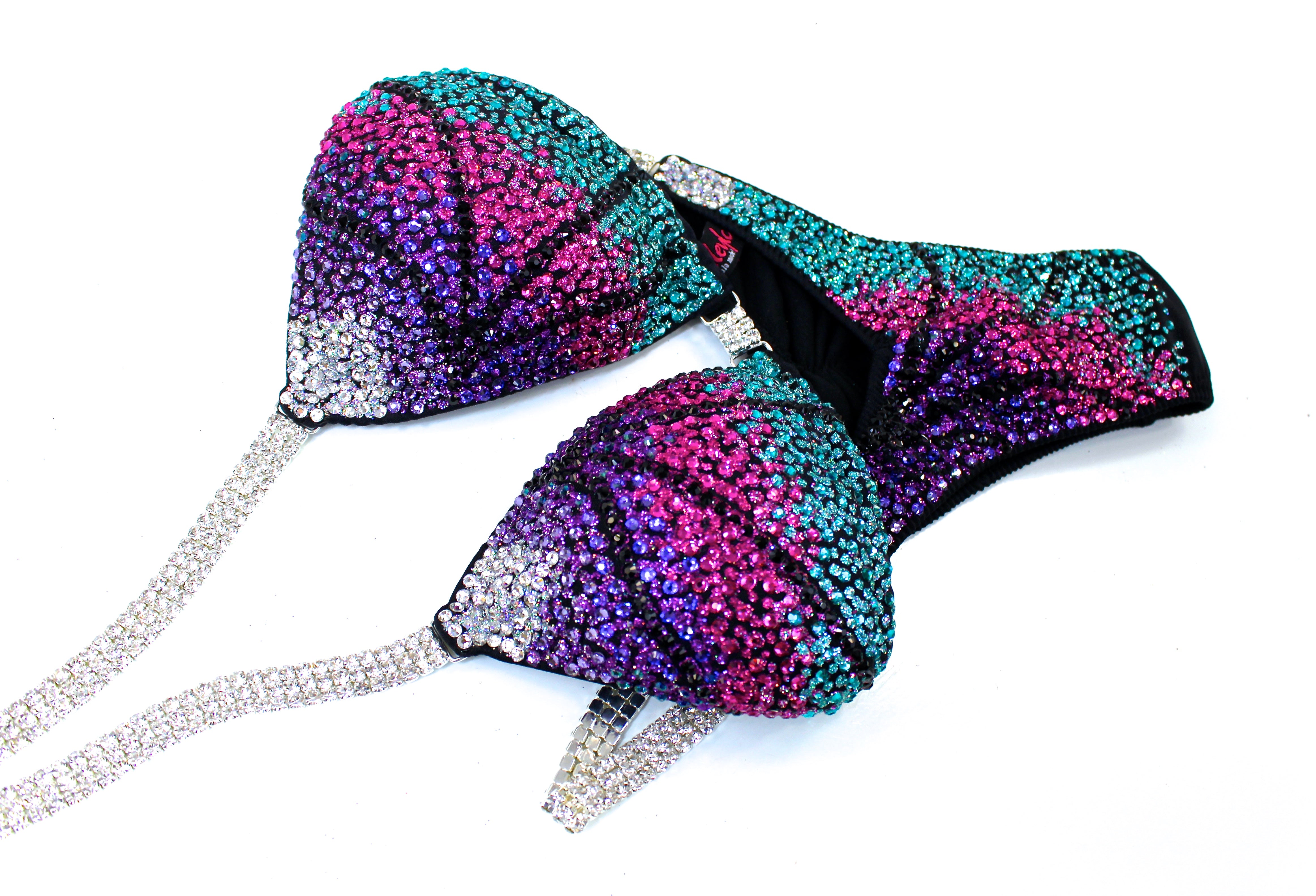 - Features: Triple crystal clear rhinestone connector at hips & bra, decorated with crystal clear, black, light purple, dark purple, fuchsia & teal rhinestones, sparkling glitter detail, pro cut back coverage, fully lined