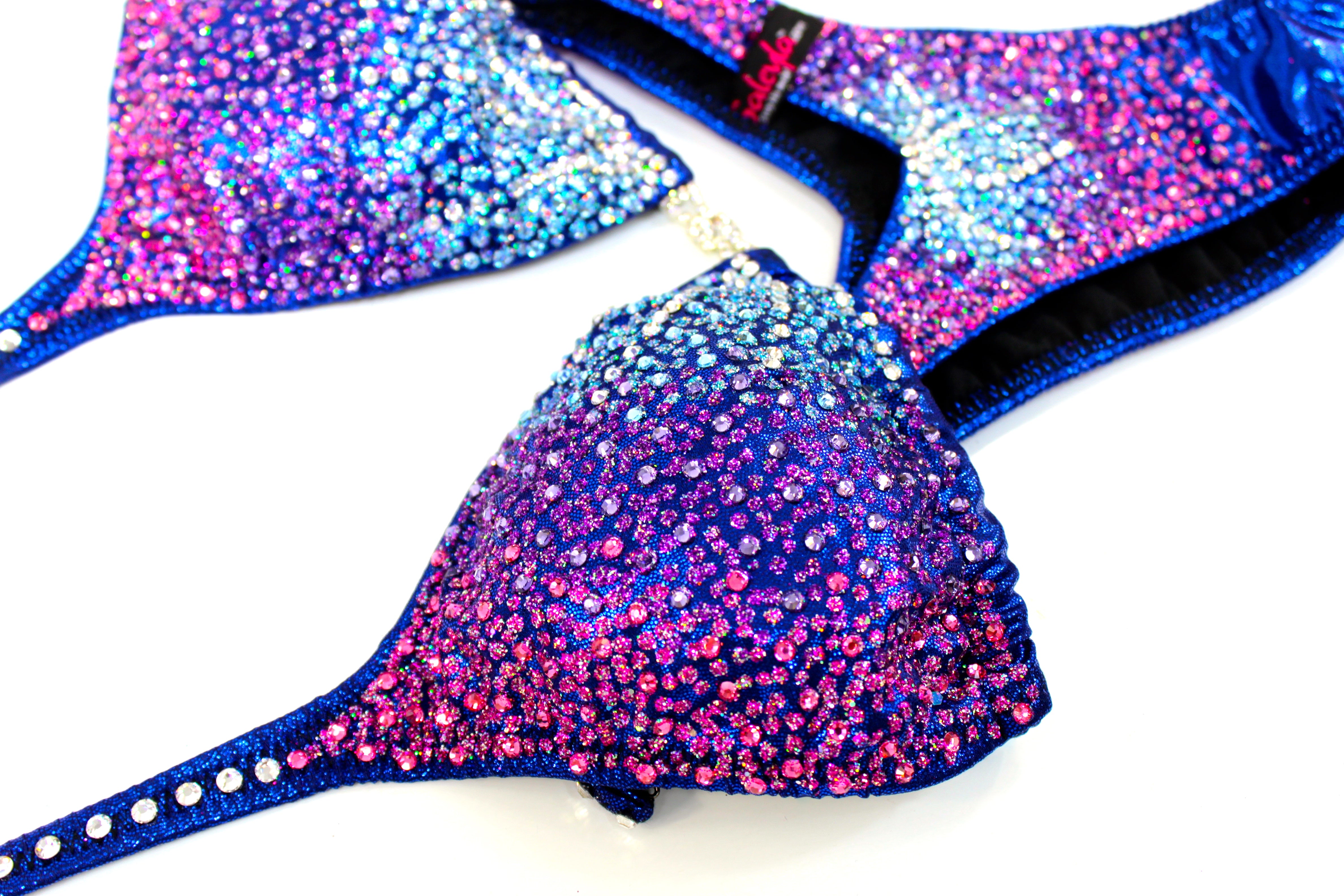 - Features: Crystal clear flower center connector, decorated with crystal clear, aquamarine, light purple & rose rhinestones in various size, sparkling glitter detail, rio back coverage, fully lined
