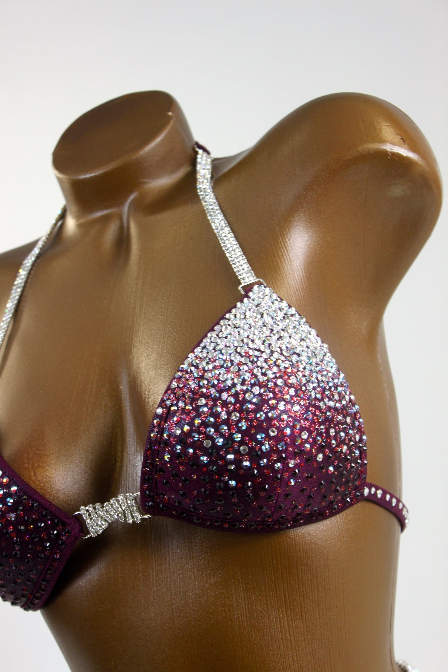 - Features: Braided rhinestone connectors at hips, triple connectors at bra, decorated with crystal clear, red AB & deep red rhinestones, sparkling glitter detail, moderate back coverage, fully lined