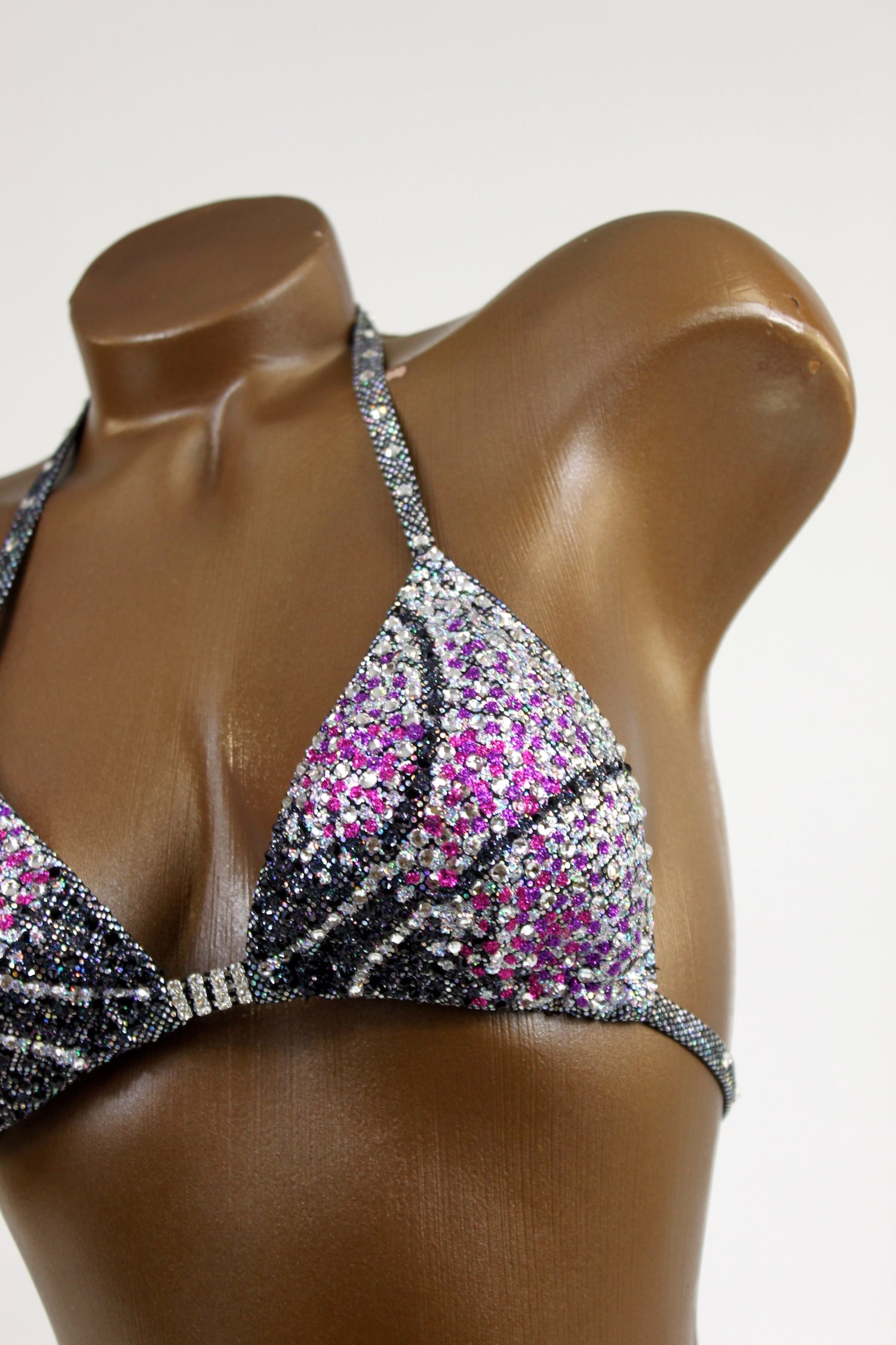 - Features: triple rhinestone connector at center bra, decorated with crystal clear & jet rhinestones, sparkling glitter detail, moderate back coverage, fully lined