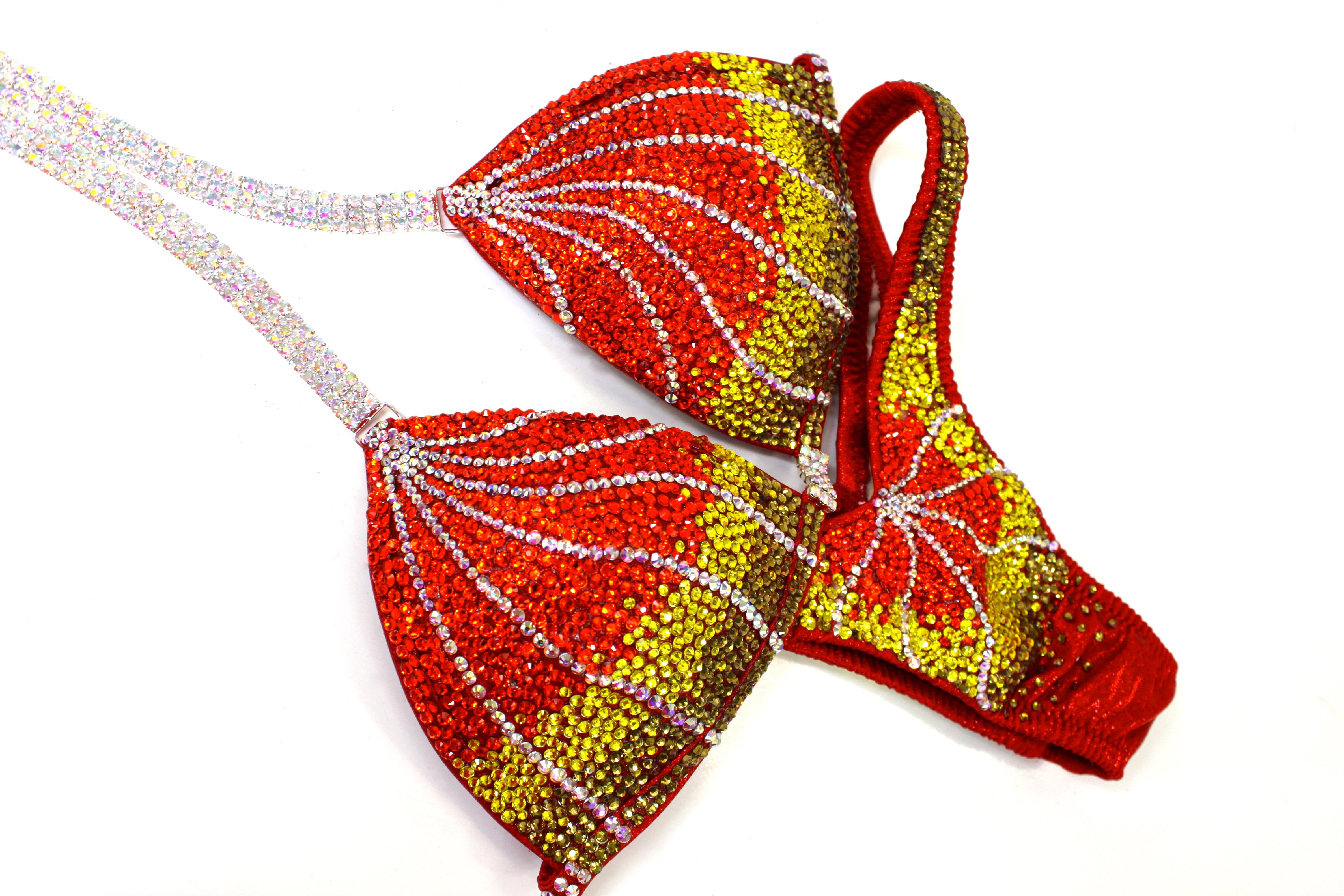- Features: Triple close up crystal AB rhinestone connector at bra, decorated with hyacinth, yellow & gold rhinestones in various sizes, pro cut scrunch back coverage, fully lined