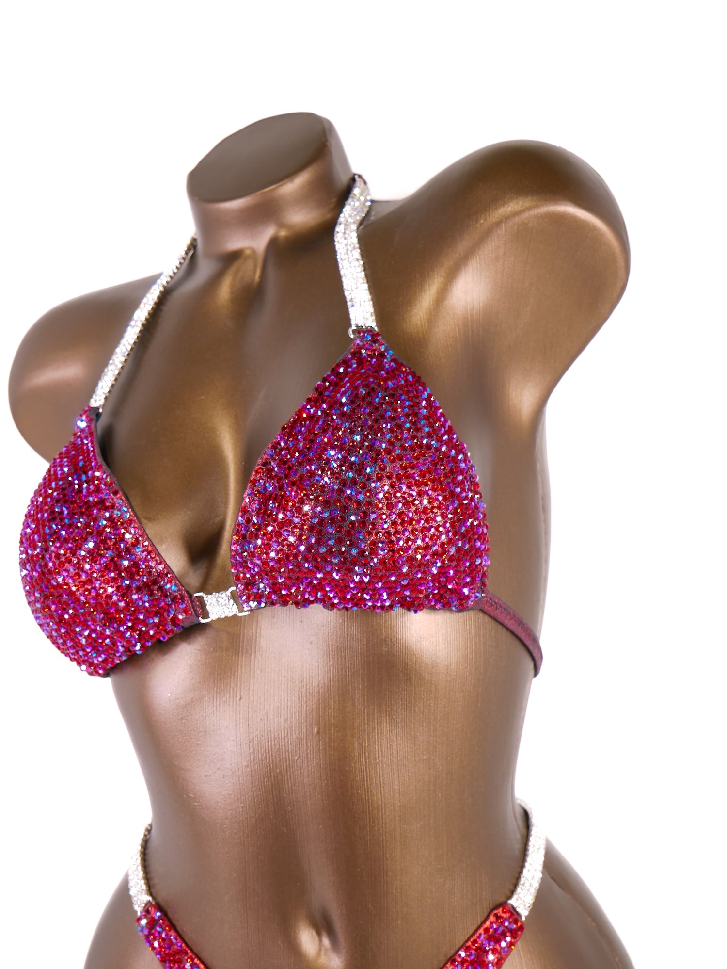- Features: Triple crystal clear rhinestone connector at bra & hip, decorated with dark red & dark red AB rhinestones, scrunch back, Rio pro back coverage