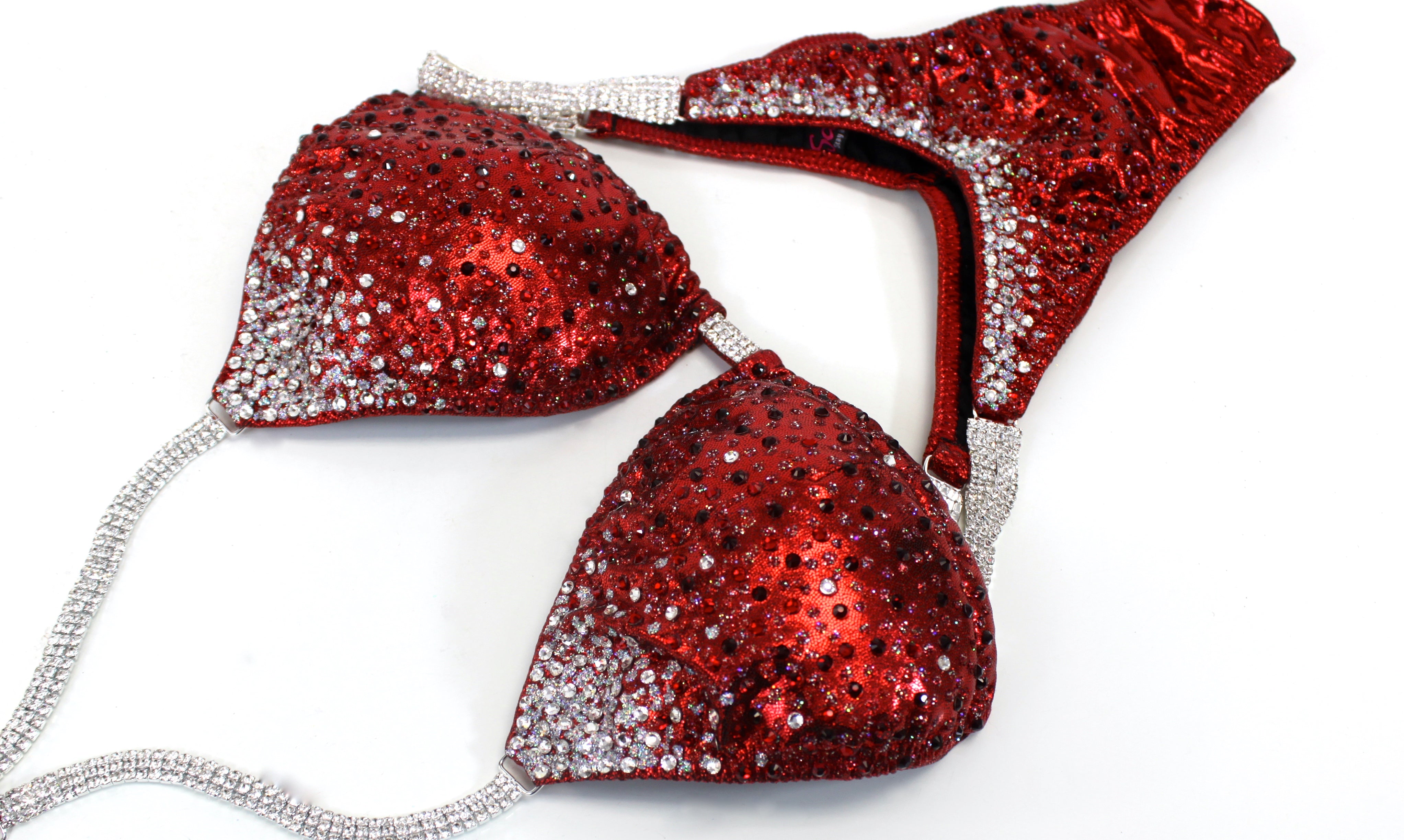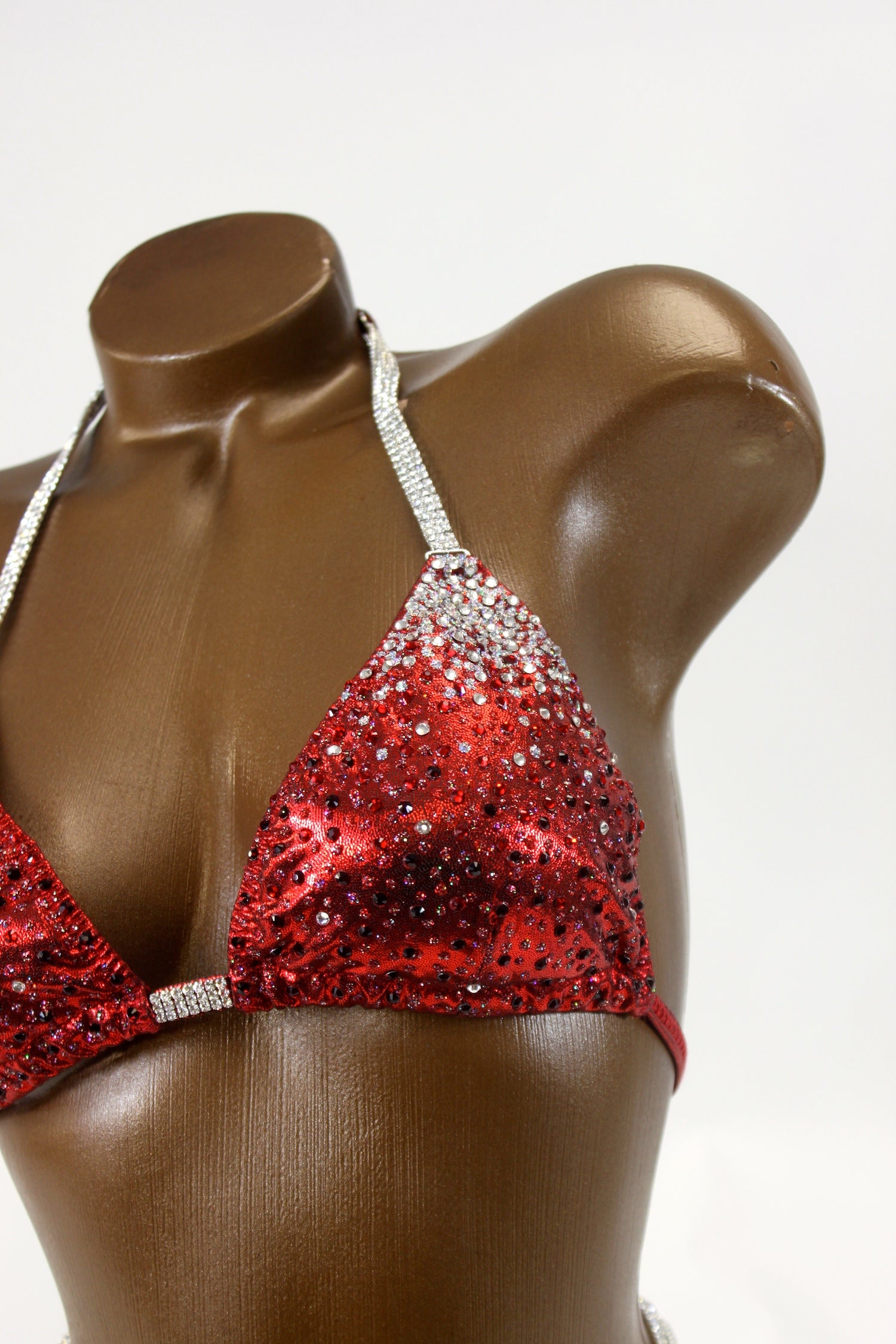 - Features: Triple close up crystal clear rhinestone connector at bra, twisted connectors at hips, decorated with crystal clear, red & deep red rhinestones, sparkling glitter detail, scrunch back, rio back coverage