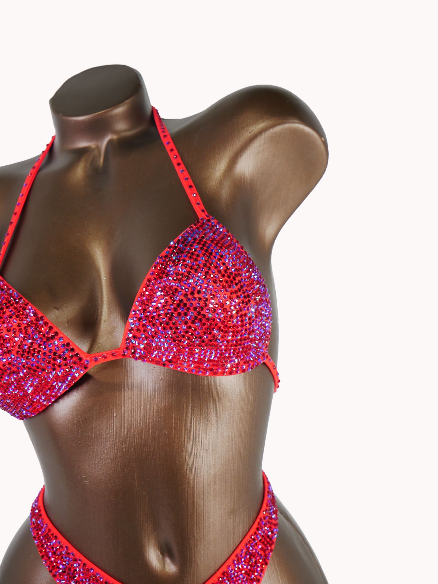 This bikini is designed using hot press czech rhinestones, applied at once to create affordable bikinis.