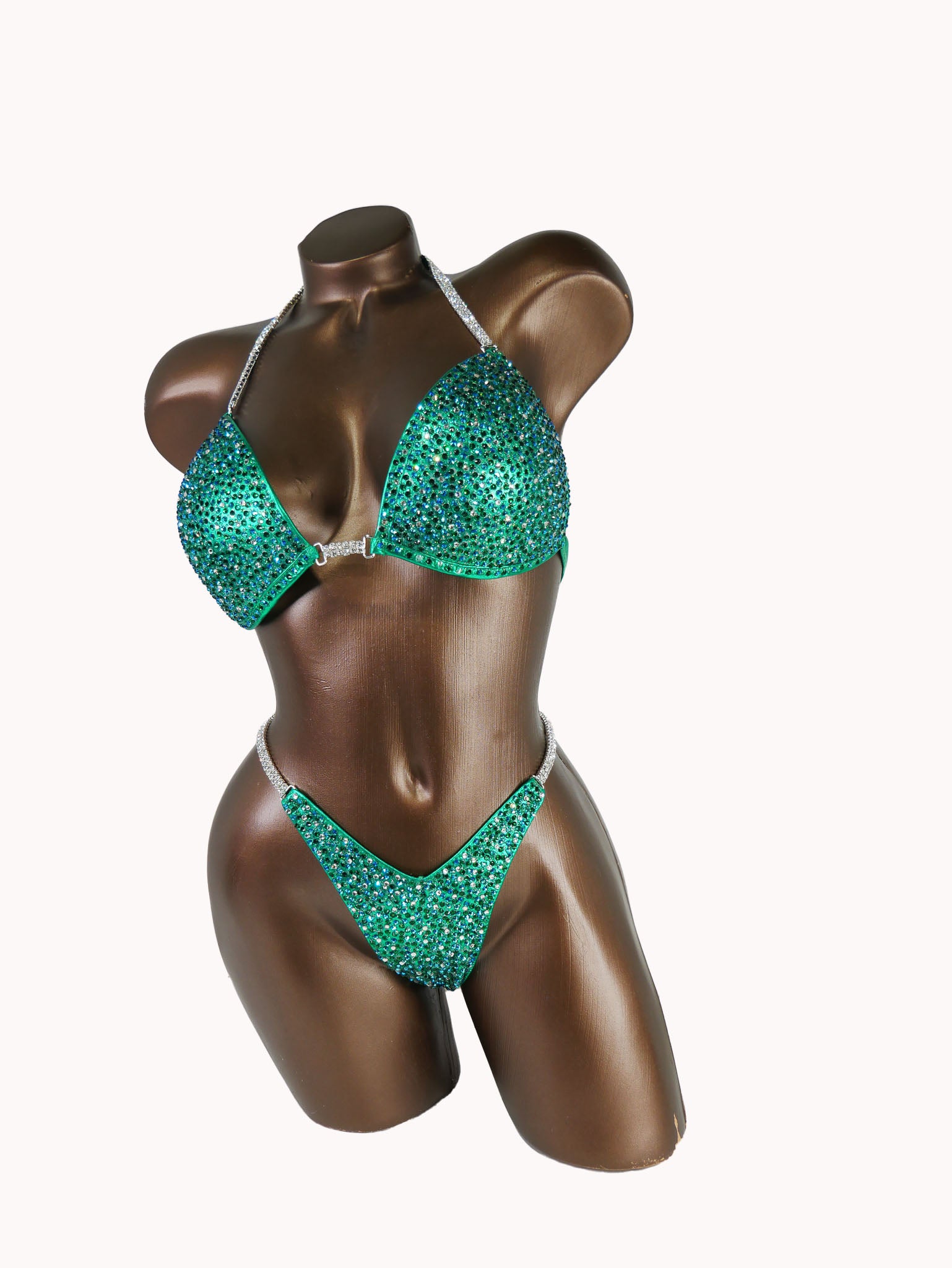 - Features: Double close up crystal clear rhinestone connector at hips & bra, decorated with crystal clear, emerald & emerald AB rhinestones, sparkling glitter detail, scrunch back,Rio Pro back coverage, fully lined