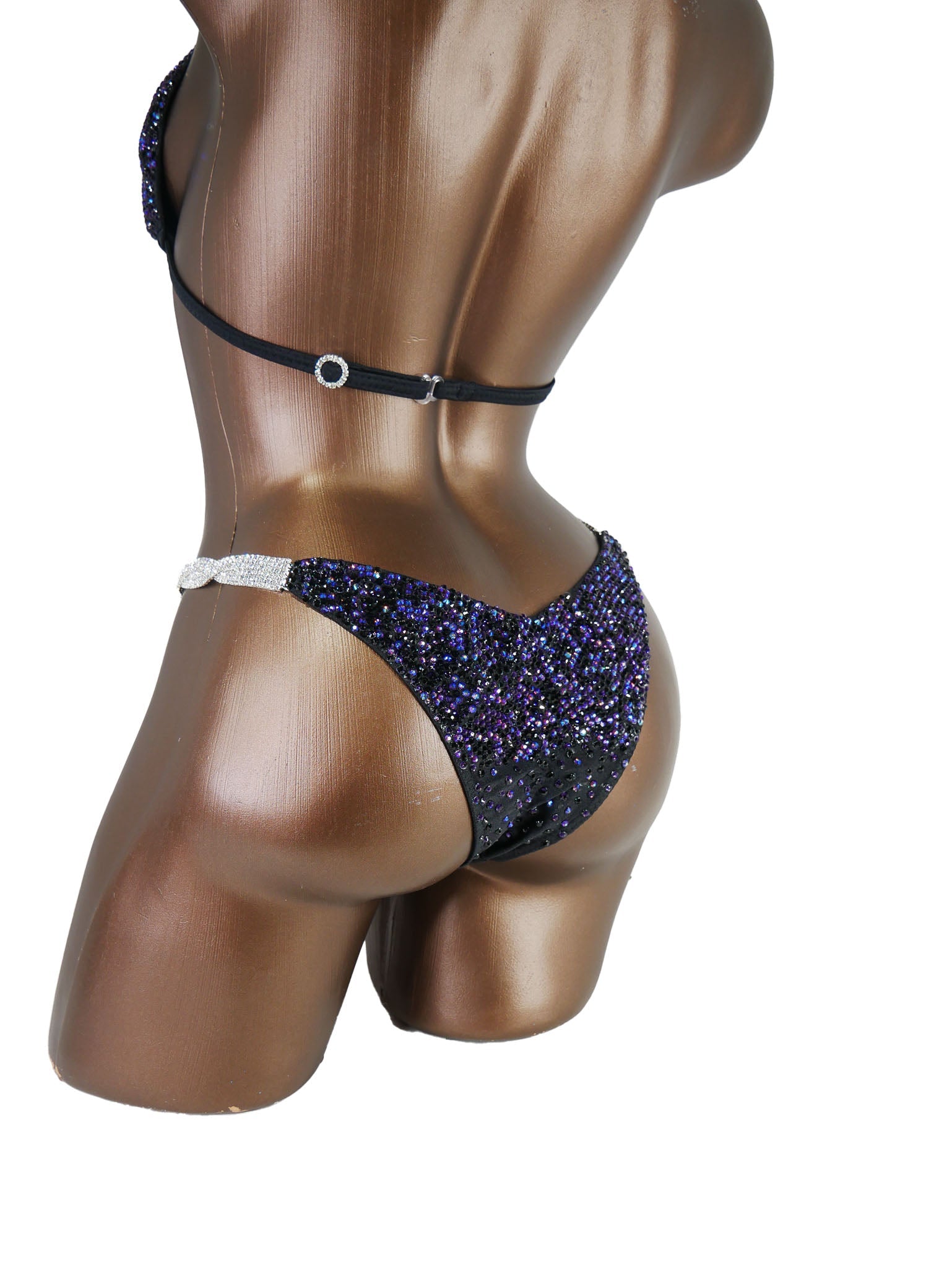 - Features: Thin Triple crystal clear rhinestone connector at bra, braided crystal clear rhinestone connector at hips, decorated with black, dark purple & purple AB rhinestones, scrunch back, Moderate back coverage