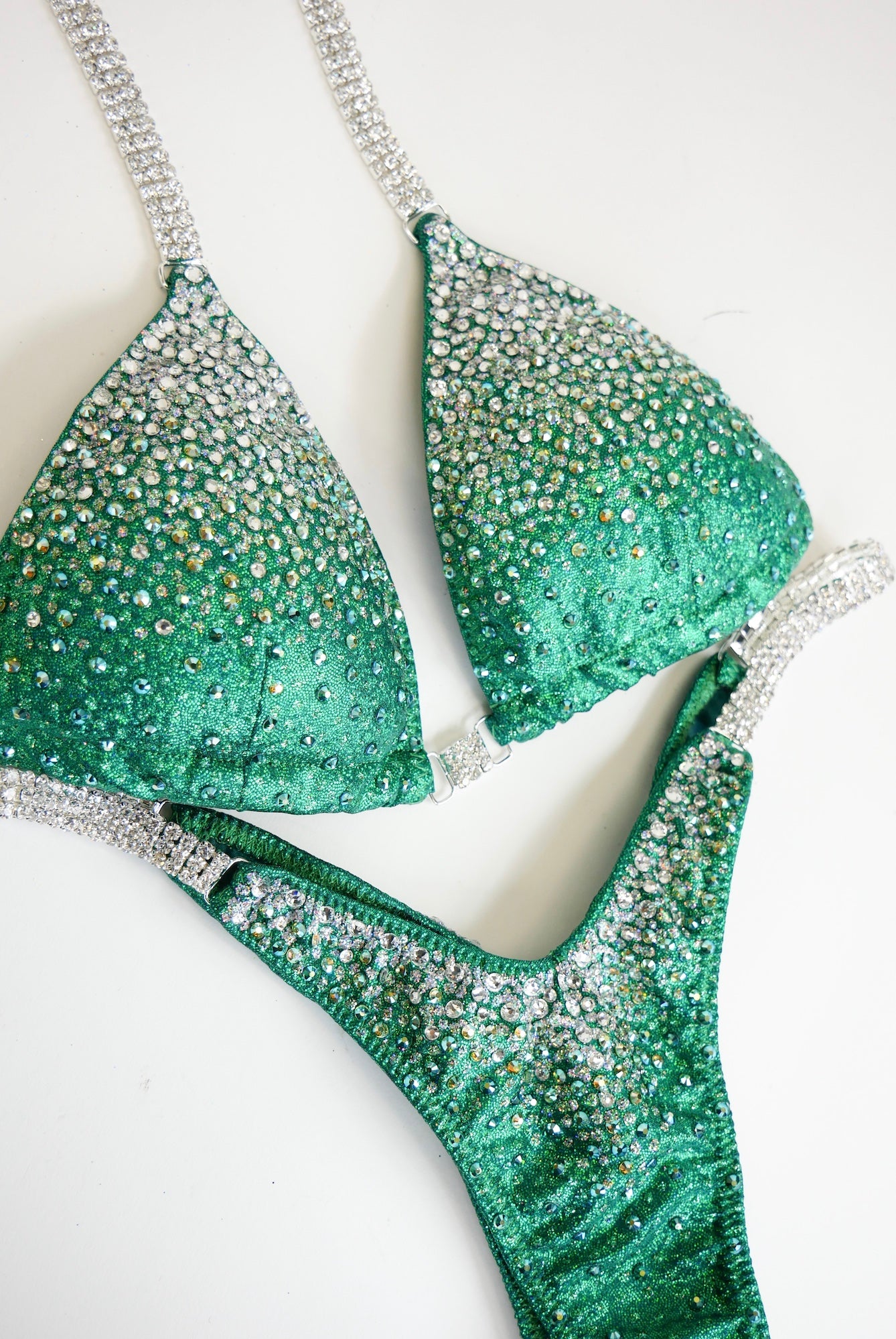 Wellness suits differ from bikini suits in several important ways: they offer slightly more glute coverage, a deeper V-shape to accentuate the hips, and crystal patterns designed to balance the upper and lower body. Whether you want a soft sparkle or a bold crystal ombré, we customize every detail — connectors, cut, color, and rhinestone density — to match your physique and competition division.