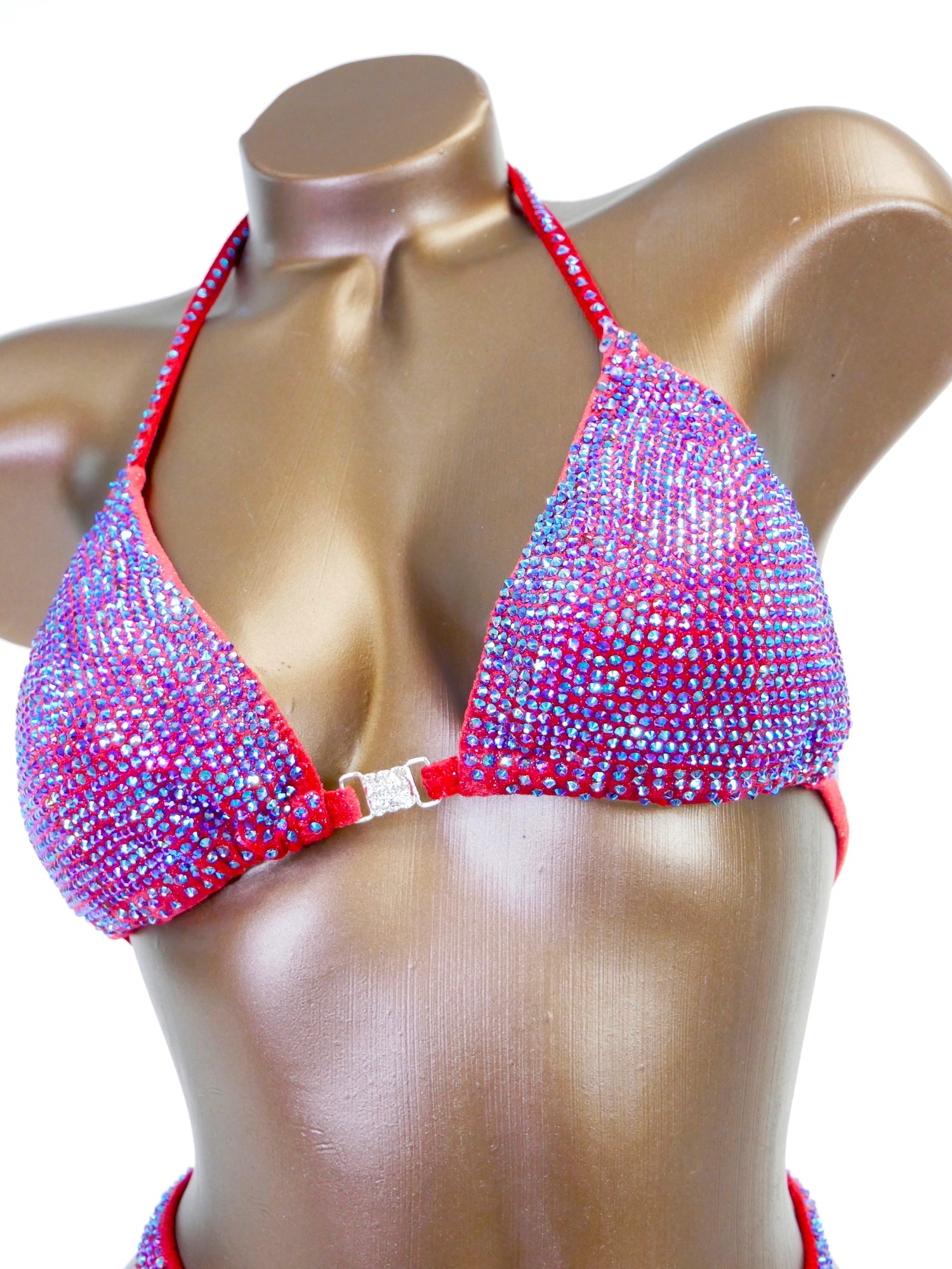 This bikini is designed using hot press czech rhinestones, applied at once to create affordable bikinis