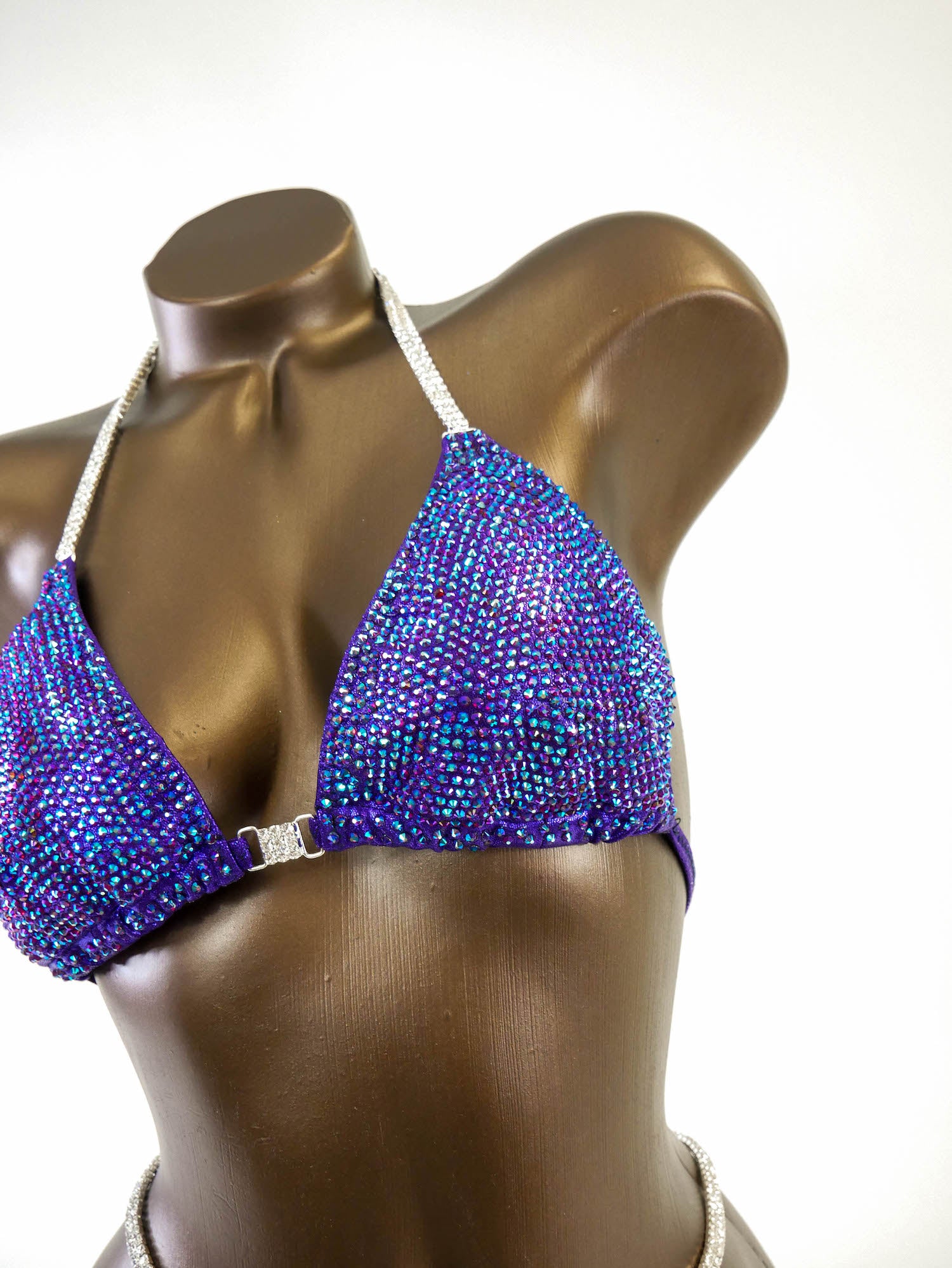 Wellness suits differ from bikini suits in several important ways: they offer slightly more glute coverage, a deeper V-shape to accentuate the hips, and crystal patterns designed to balance the upper and lower body. Whether you want a soft sparkle or a bold crystal ombré, we customize every detail — connectors, cut, color, and rhinestone density — to match your physique and competition division.