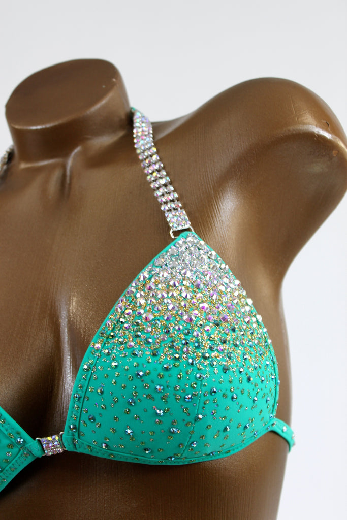- Features: Triple crystal AB rhinestone connectors at hips & bra, decorated with crystal AB, crystal clear & emerald AB rhinestones in various sizes, sparkling glitter detail, scrunch back, moderate back coverage