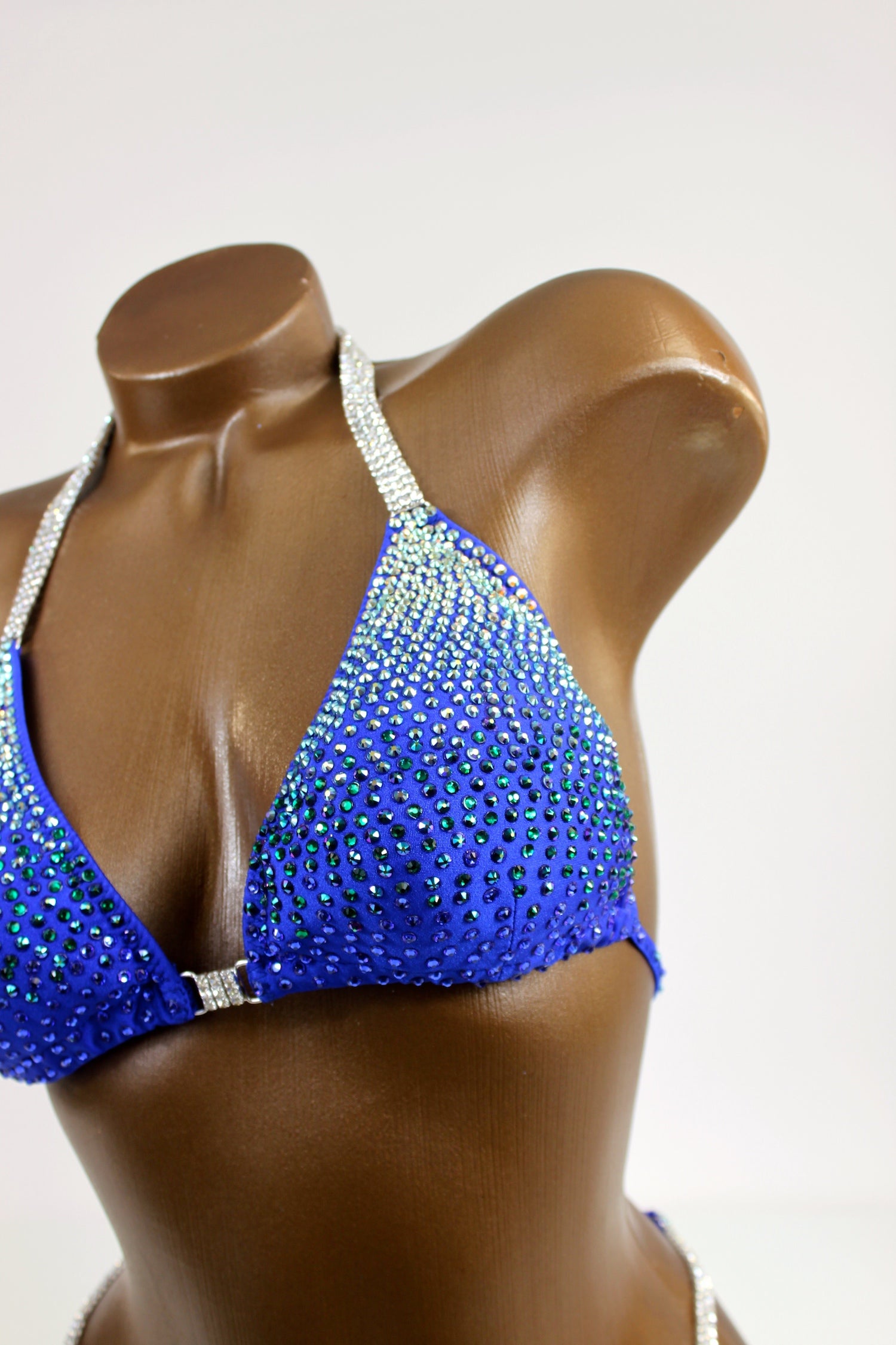 - Features: Triple close up crystal clear rhinestone connectors at hips & bra, decorated with peridot AB, capri AB, emerald & sapphire rhinestones, scrunch back, pro cut rio back coverage