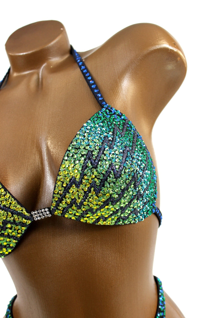 - Features: Rhinestone connector at center bra, decorated with yellow, light green, emerald AB , emerald & capri blue rhinestones, sparkling glitter detail, moderate back coverage, fully lined