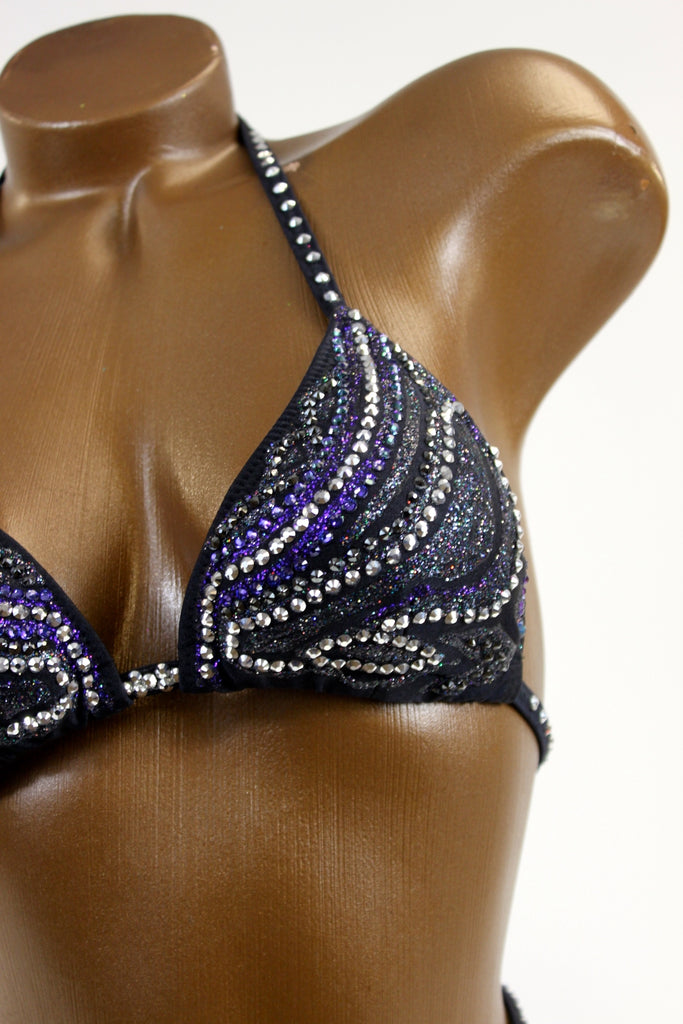 - Features: Decorated with jet hematite, dark purple & silver metallic rhinestones, sparkling glitter detail, rio back coverage, fully lined