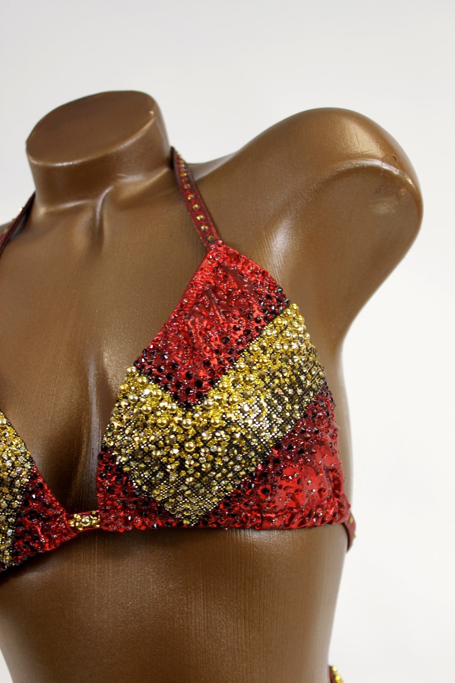 - Features: Decorated with gold, gold metallic, gold pearls, red & deep red rhinestones, sparkling glitter detail, rio back coverage, fully lined