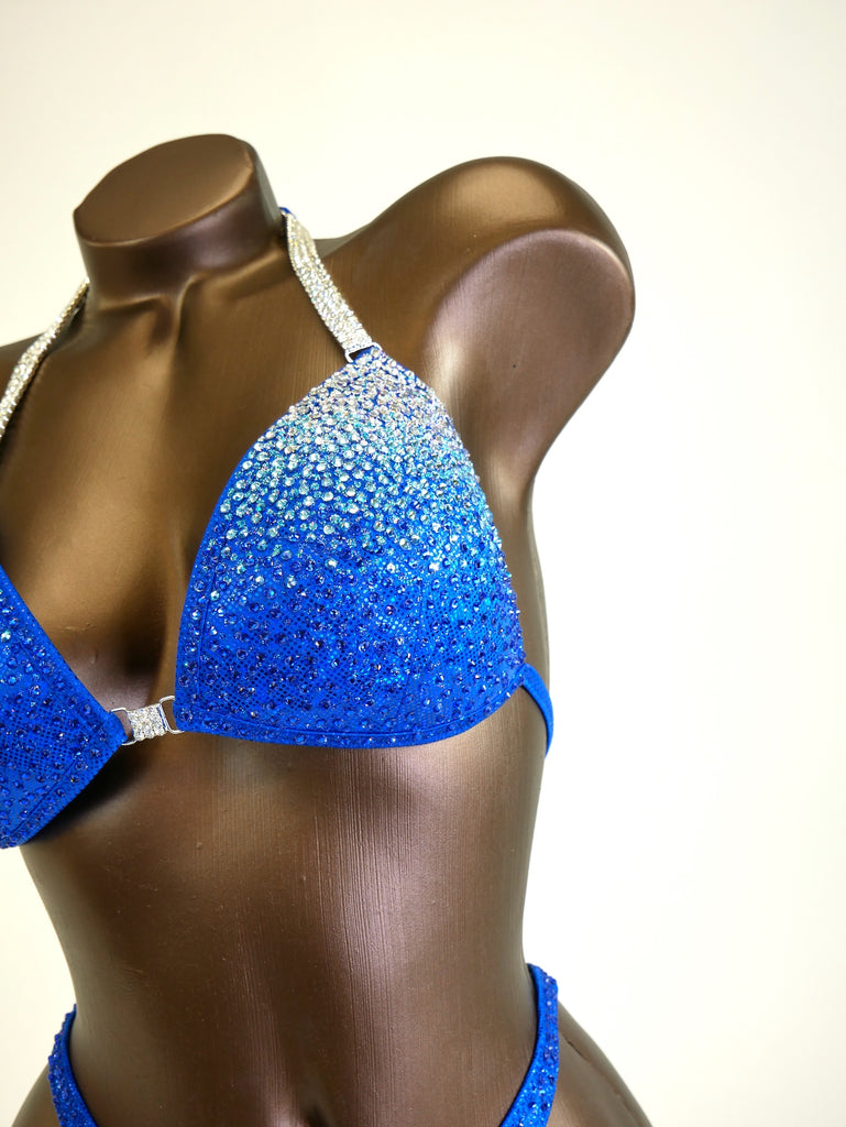 - Features: Triple close up crystal clear rhinestone connector at bra, decorated with crystal clear, aquamarine, capri blue AB, bermuda blue rhinestones, sparkling glitter detail, scrunch back, Rio Pro back coverage