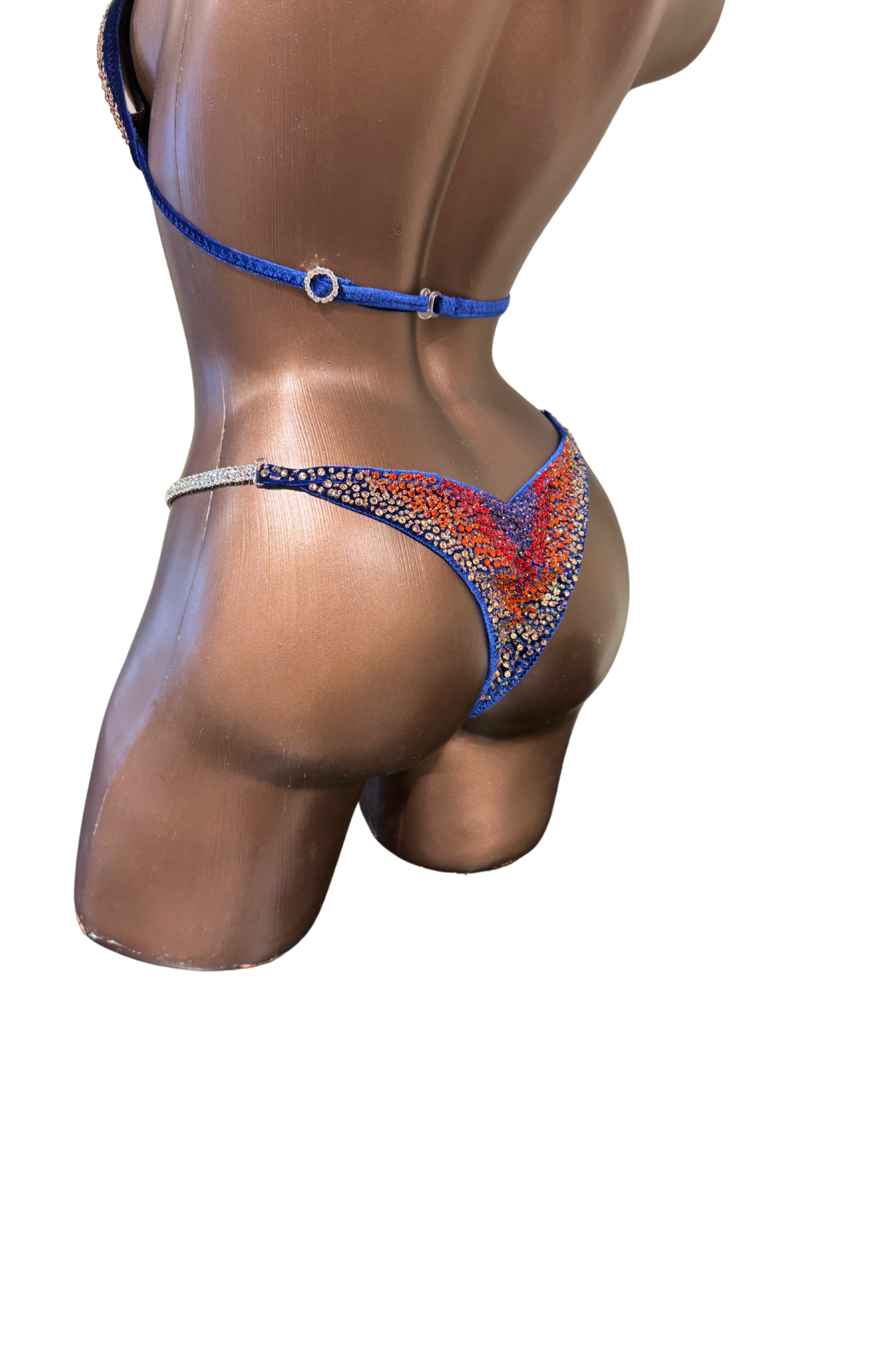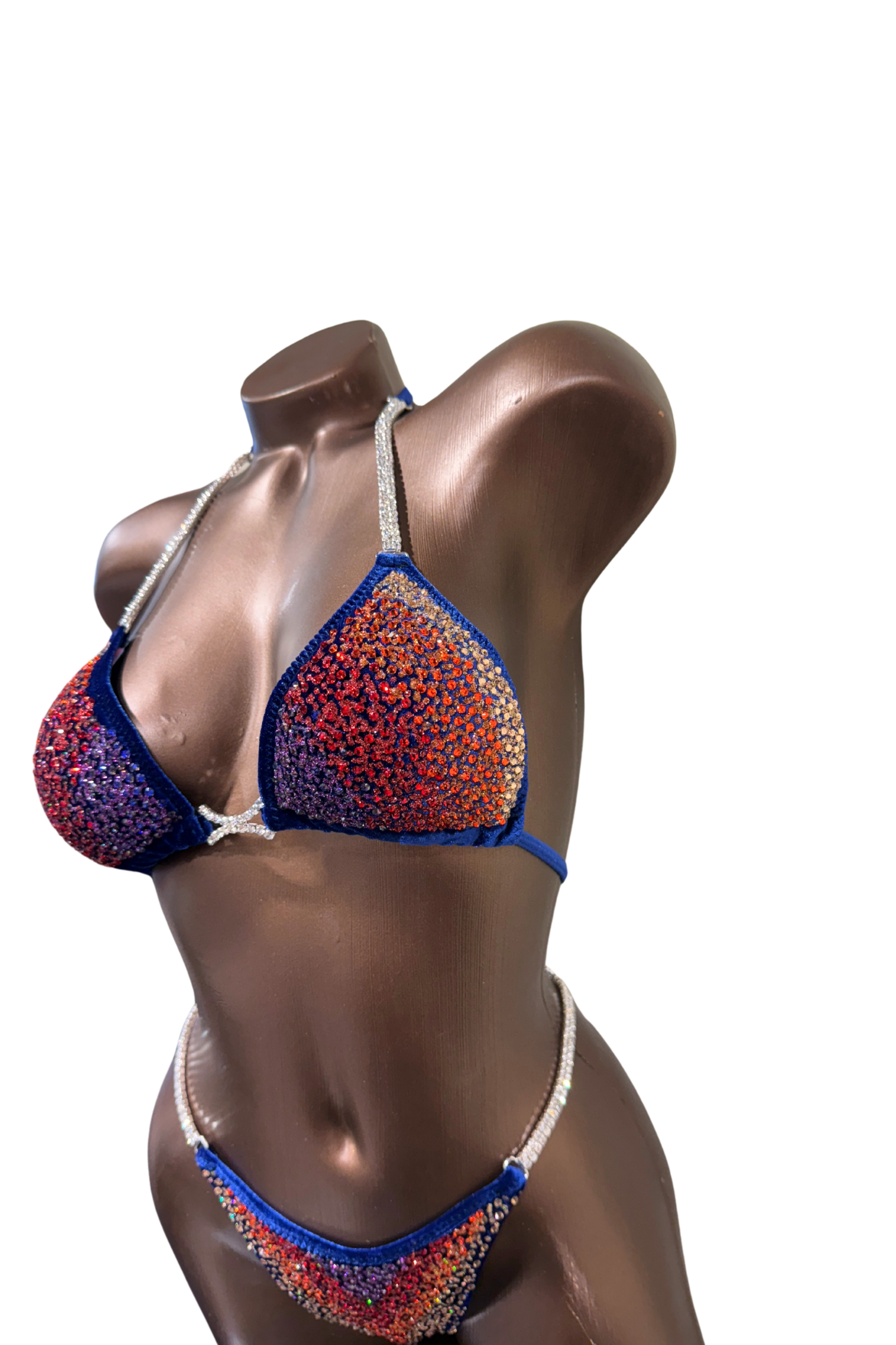 - Features: Double close up connectors at bra & hips, decorated with dark purple, red, orange & light peach rhinestones, sparkling glitter detail, scrunch back, rio pro back coverage