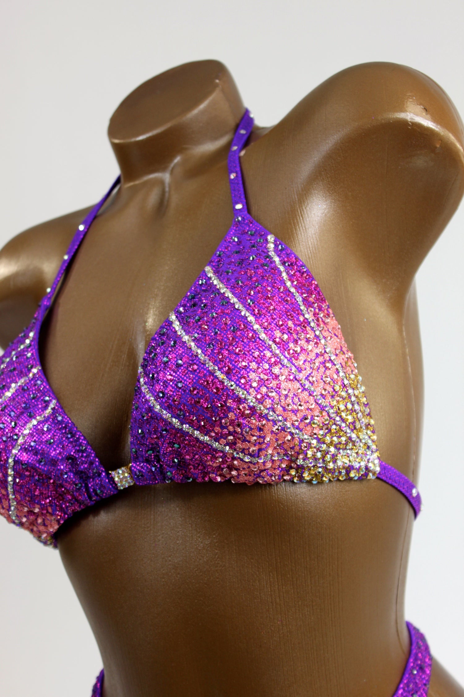 - Features: crystal AB rhinestone buckle at center bra, decorated with crystal AB, light gold, light rose, fuchsia & dark purple rhinestones, sparkling glitter detail, moderate back coverage, fully lined