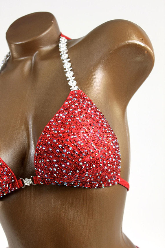 - Features: Small flower crystal clear rhinestone connectors at hips & bra, decorated with red & red AB rhinestones, scrunch back, rio pro cut back coverage