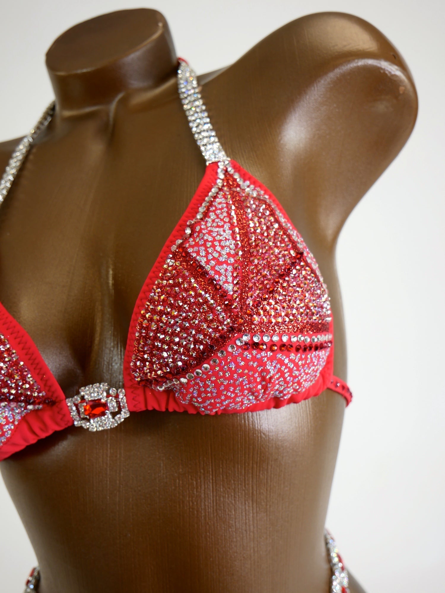 - Features: Crystal clear & red rhinestone connector at hips, triple connectors at bra, decorated with crystal clear & red rhinestones, sparkling glitter detail, scrunch back, Rio Pro back coverage