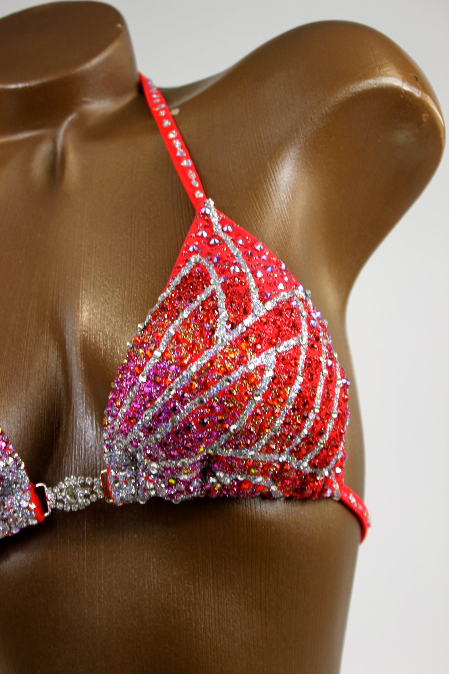 - Features: Rhinestone connector at center bra, decorated with crystal clear, fuchsia, volcano, red, orange & red AB rhinestones, sparkling glitter detail, pro cut rio back coverage, fully lined