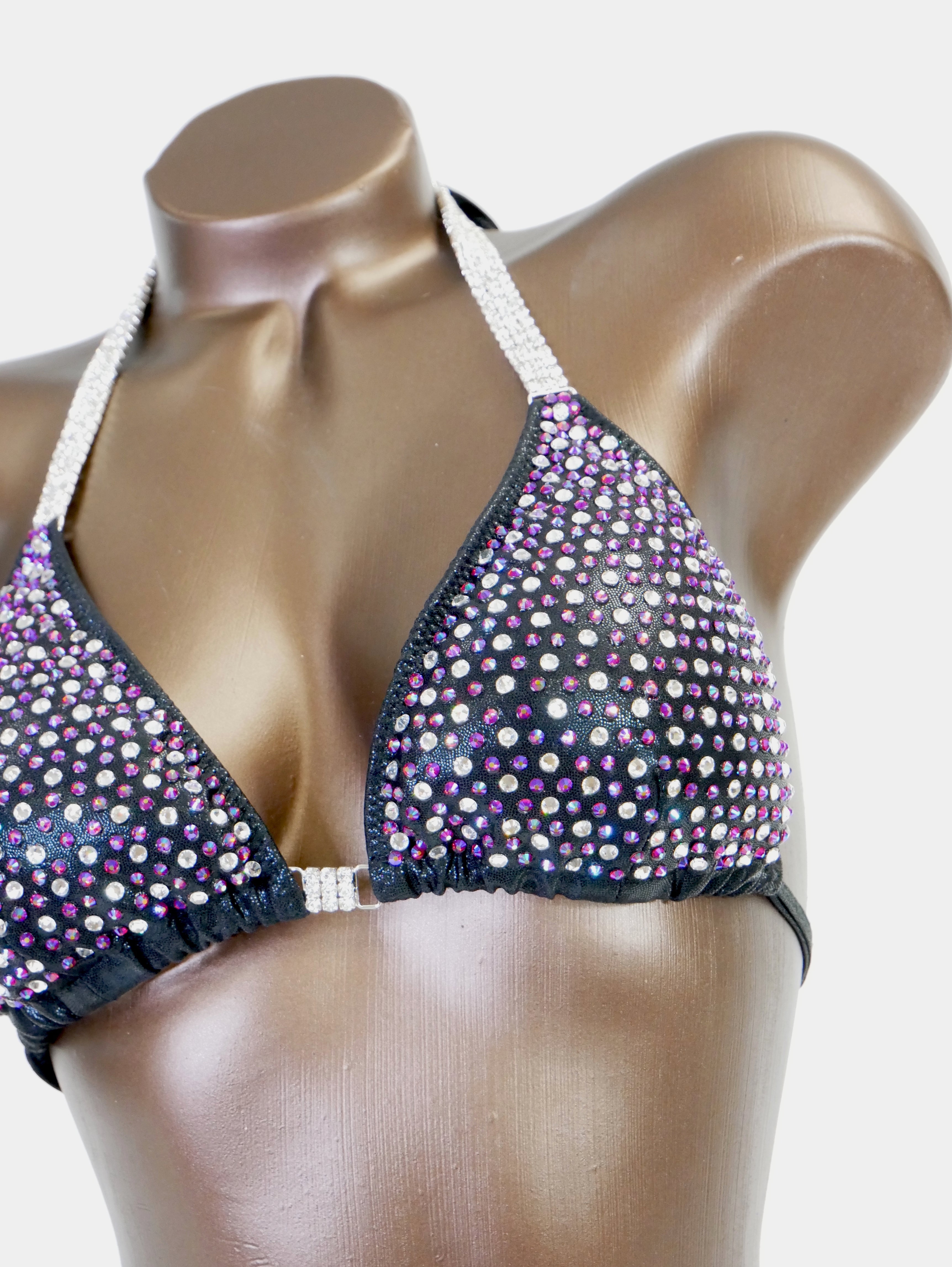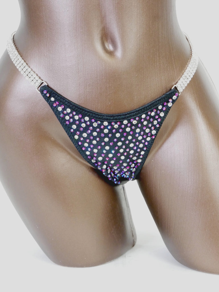 - Features: Triple close up crystal clear rhinestone connector at hips & bra, Crystal clear buckle at center, decorated with light siam AB and clear rhinestones, scrunch back, Moderate back coverage