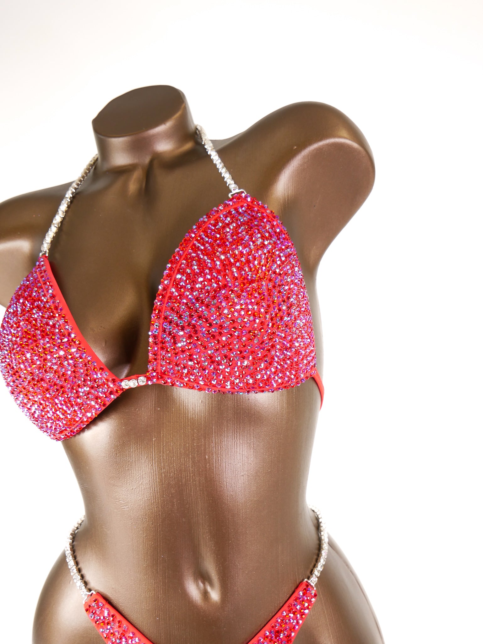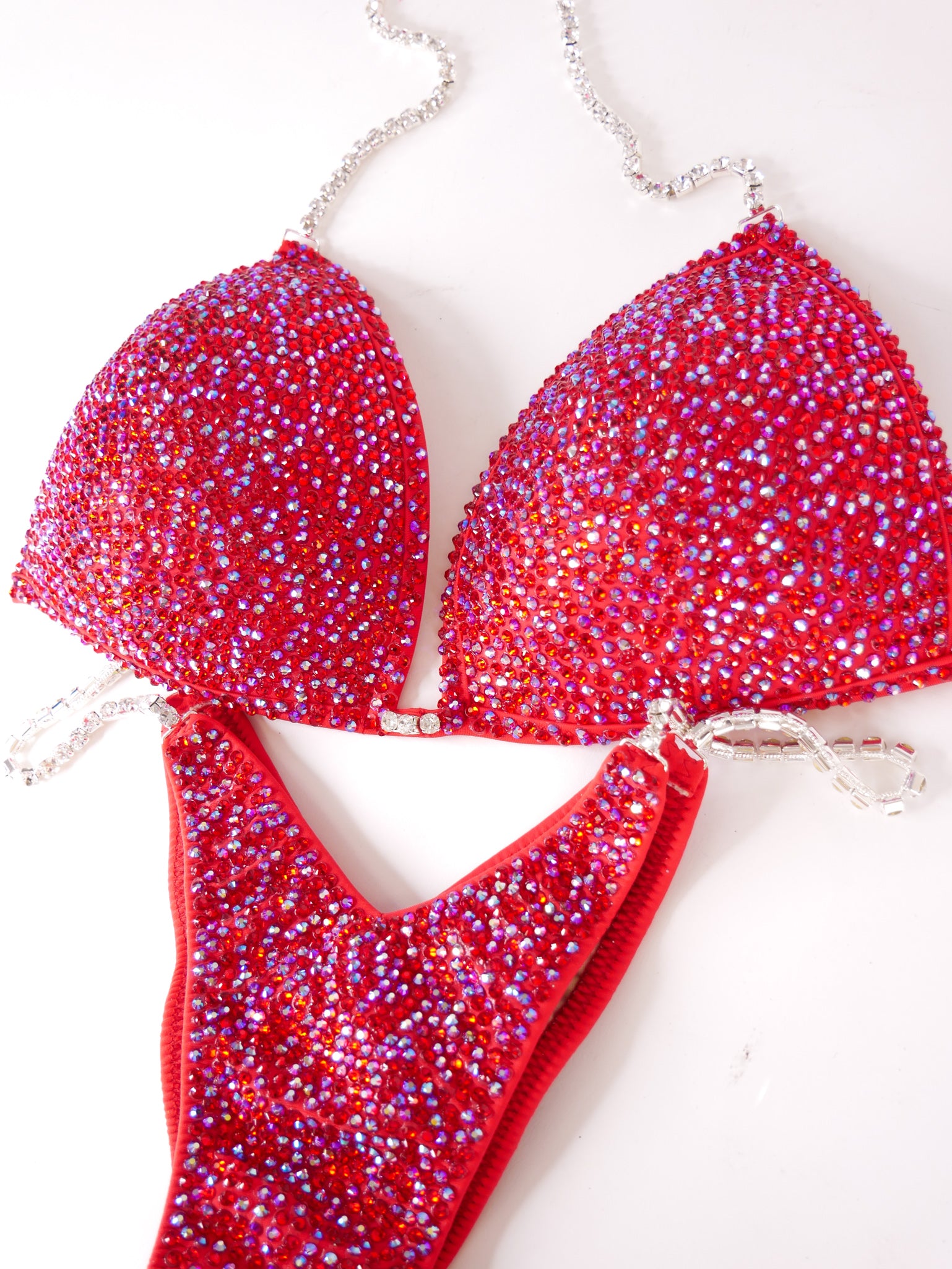 - Features: Single crystal clear rhinestone connectors at the bra, decorated with red & red AB rhinestones, Rio back coverage, scrunch bottom, fully lined