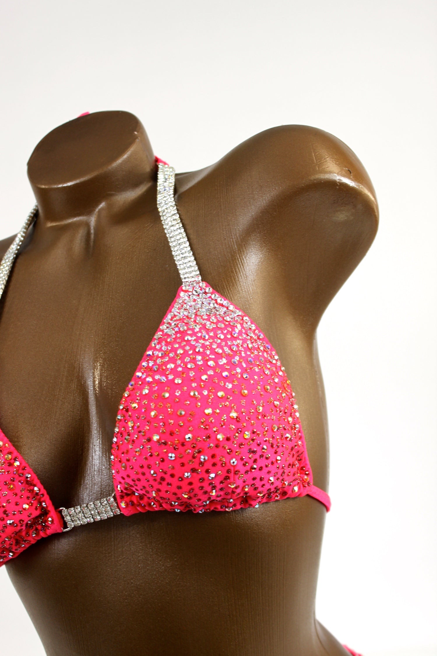 - Features: Triple close-up crystal clear rhinestone connectors at hips & bra, decorated with crystal clear, crystal AB & hyacinth AB rhinestones, scrunch back, rio back coverage