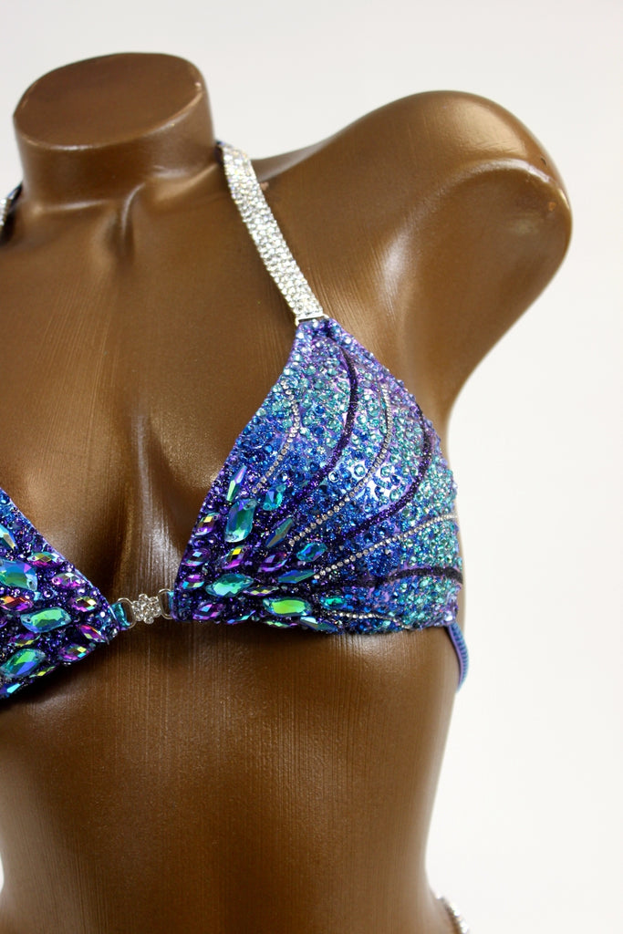 - Features: Triple close-up crystal clear rhinestone connector at hips & bra, decorated with fuchsia & fuchsia AB rhinestones, sparkling glitter detail, scrunch back, rio back coverage
