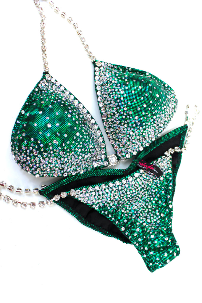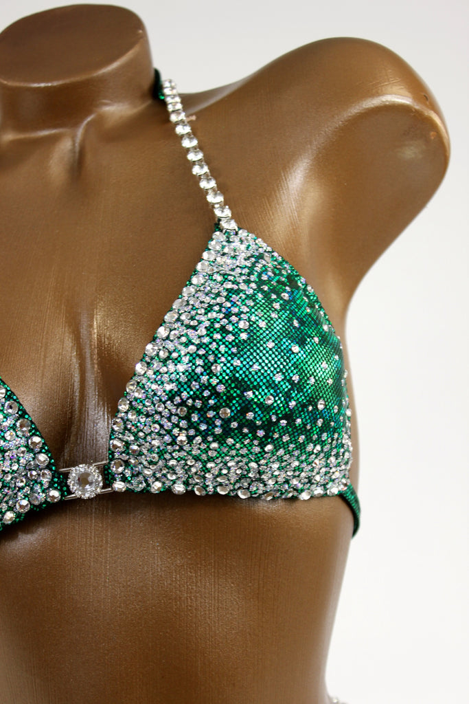 - Features: Single crystal clear rhinestone connectors at hips & bra, decorated with crystal clear rhinestones, sparkling glitter detail, scrunch back, moderate back coverage
