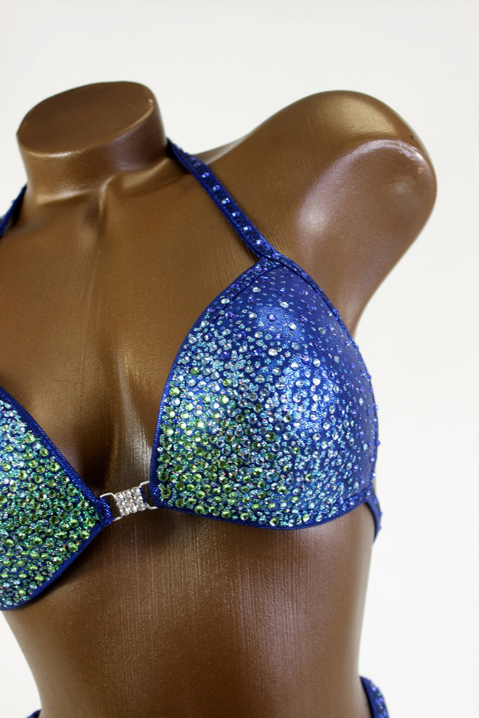 - Features: Rhinestone buckle at center bra, decorated with aquamarine, light green & sapphire rhinestones, rio back coverage, fully lined