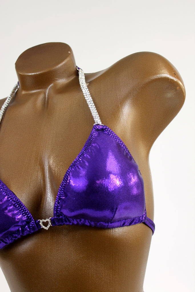 - Features: Double crystal clear rhinestone connector at hips, double crystal clear at center bra, scrunch back, rio back coverage