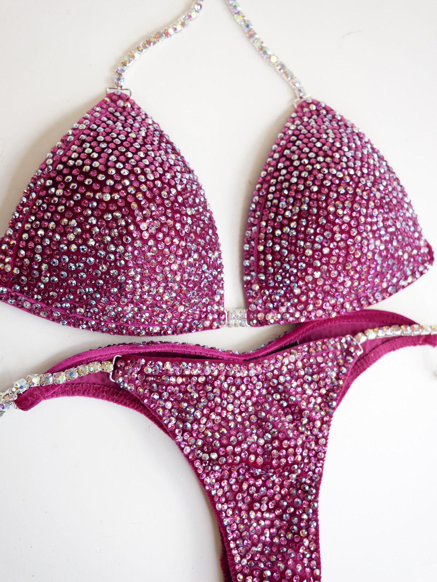 - Features: Single AB connectors at hips & bra, decorated with fuchsia, fuchsia AB, and crystal AB rhinestones, scrunch back, pro cut rio back coverage