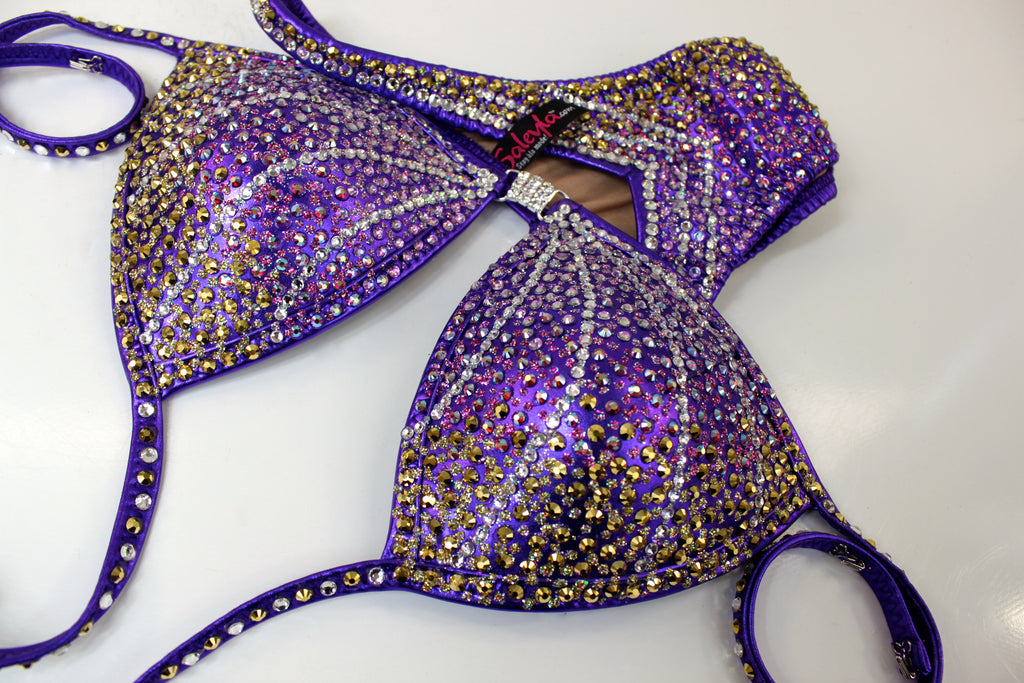 - Features: Crystal clear rhinestone connector at the center bra, decorated with crystal clear, vitrail AB, fuchsia AB & gold metallic rhinestones, sparkling glitter detail, pro cut rio back coverage, fully lined