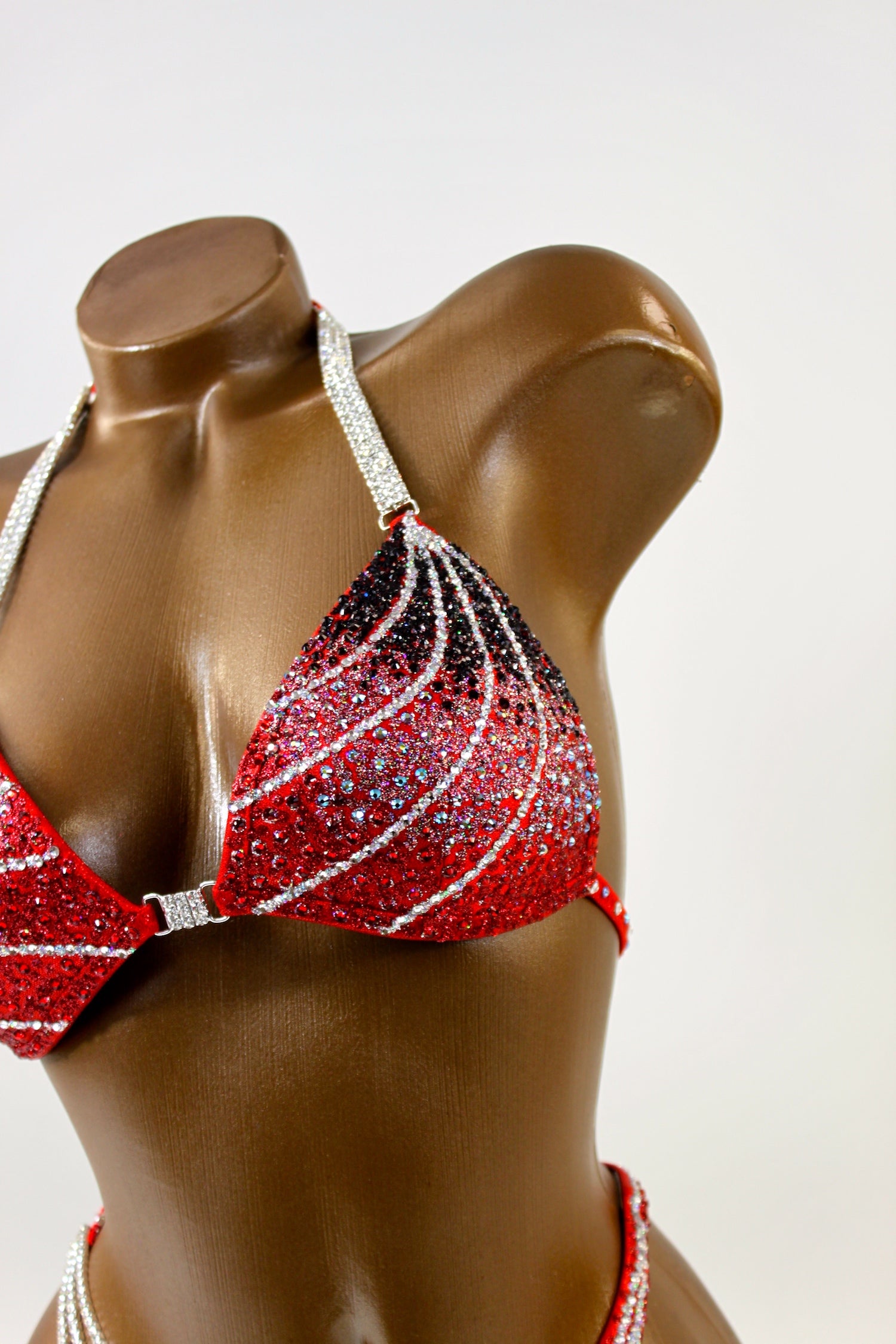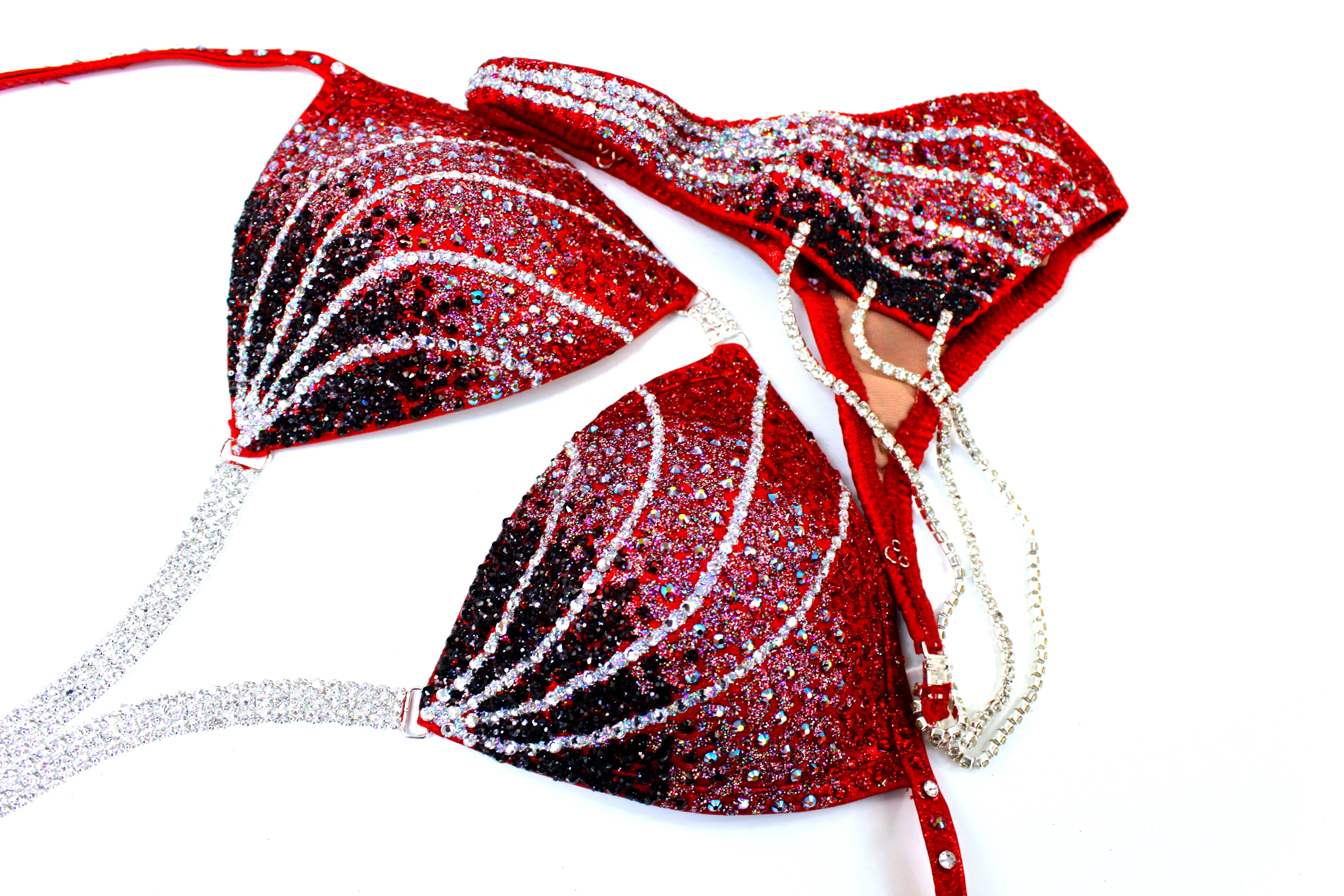 - Features: Triple close up crystal clear rhinestone connector at bra, decorated with crystal clear, black, deep red, red AB & red rhinestones, sparkling glitter detail, pro cut rio back coverage, fully lined