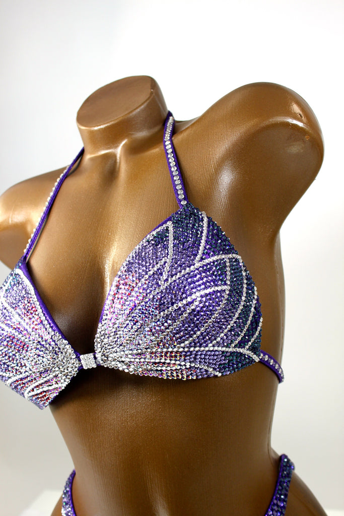 - Features: Rhinestone buckle at center bra, decorated with crystal clear, crystal AB, fuchsia AB, light purple & dark purple rhinestones, rio back coverage, fully lined
