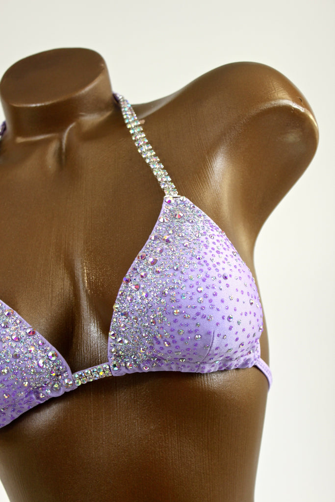 - Features: Triple hanging crystal AB rhinestone connectors at hips, double connectors at bra, decorated with crystal AB rhinestones in various sizes, sparkling glitter detail, scrunch back, moderate back coverage