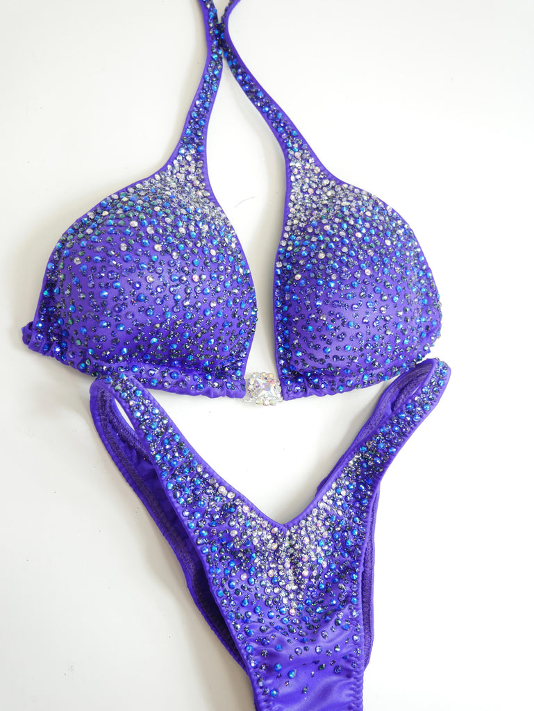 - Features: AB Square rhinestone connector at center bra, decorated with crystal AB, light purple, dark purple, and sapphire rhinestones, sparkling glitter detail, scrunch back, Rio Pro Cut back coverage