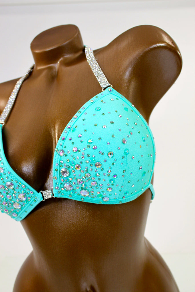 - Features: Double clear & 2 lines hanging rhinestone connectors at hips, triple close-up connectors at bra, double having back connector, decorated with crystal AB & light mint AB rhinestones, sparkling glitter detail, scrunch back, moderate back coverage
