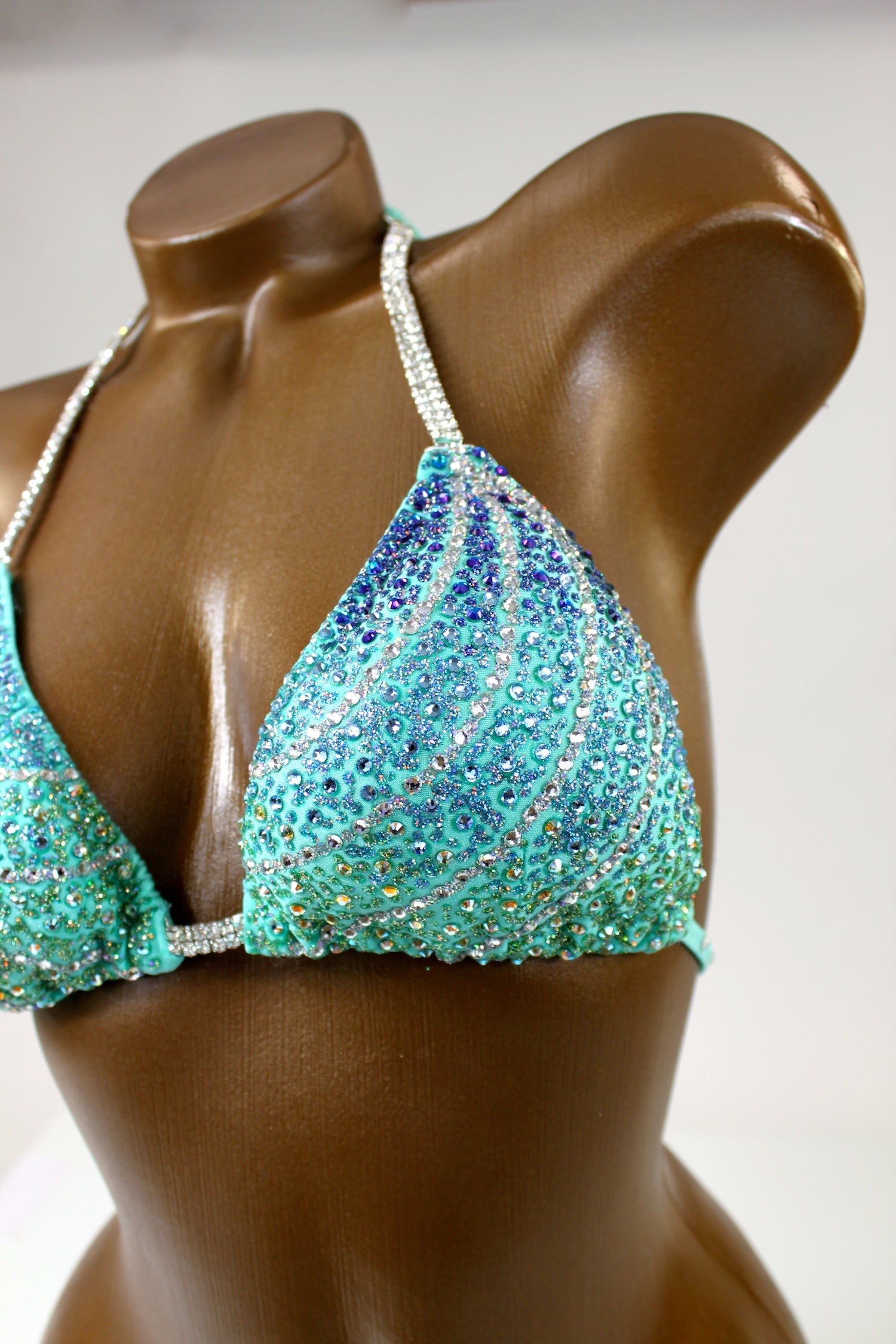 - Features: Double close up crystal clear rhinestone connectors at bra, decorated with crystal clear, bermuda blue, light aquamarine & light mint AB rhinestones in various size, sparkling glitter detail, rio back coverage, fully lined