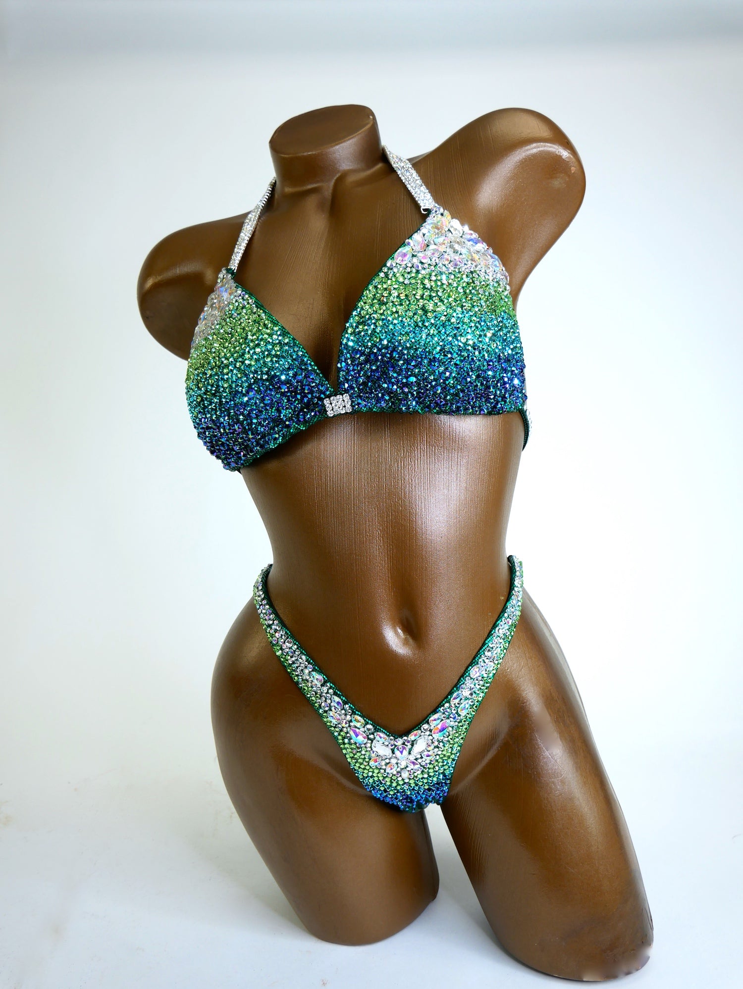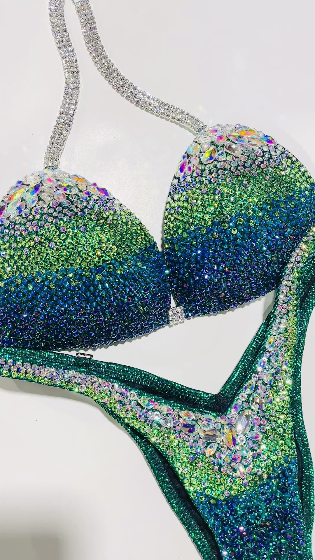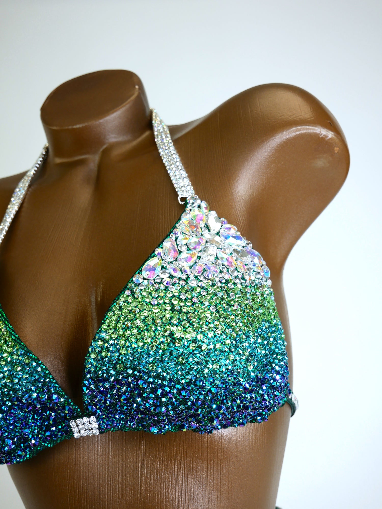- Features: Crystal clear triple closeup connectors at bra, decorated with crystal AB, emerald AB, Scarabeus AB, Light green, Light green AB rhinestones, Rio Pro back coverage