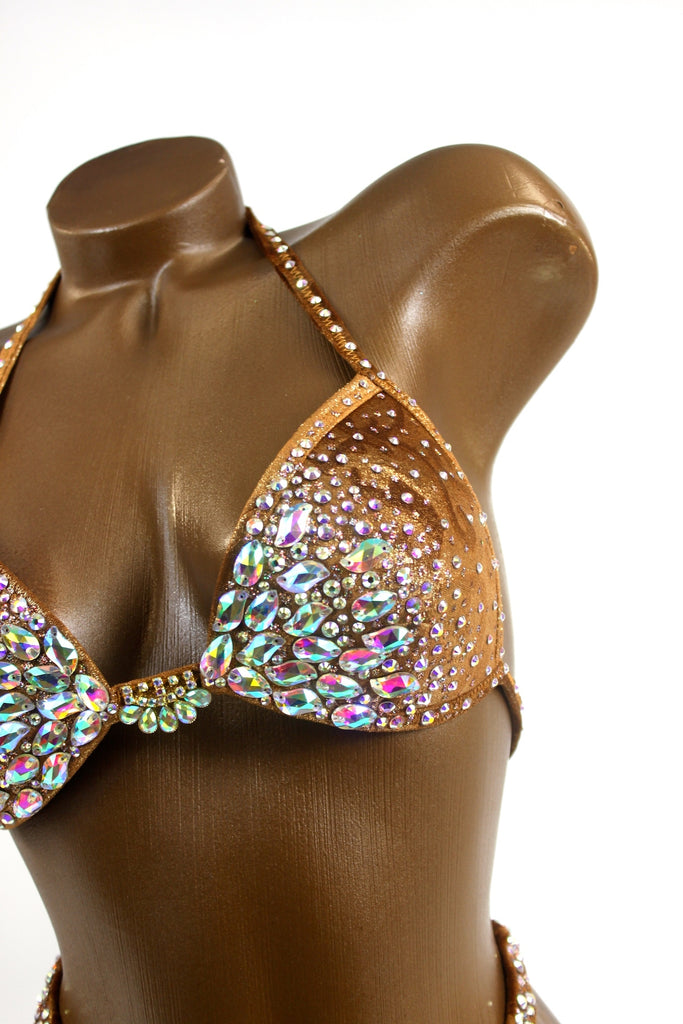 - Features: Crystal AB rhinestone connector at bra, decorated with crystal AB rhinestones, sparkling glitter detail, moderate back coverage, scrunch back, fully lined