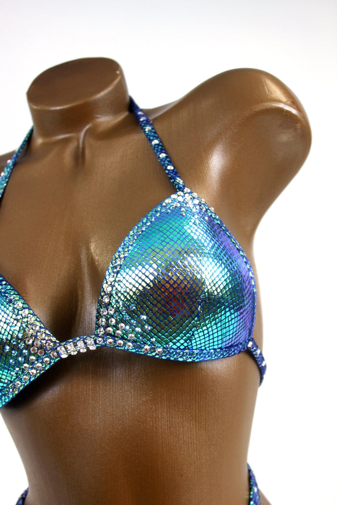 - Features: Double crystal clear rhinestone connector at bra, decorated with crystal clear & capri blue AB rhinestones, sparkling glitter detail, pro cut rio back coverage, fully lined