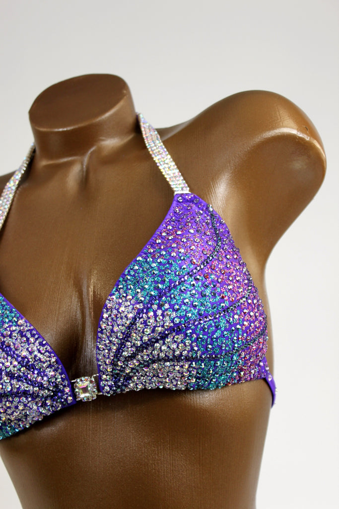 - Features: Triple crystal AB close up rhinestone connectors at bra & hips, rhinestone square at center bra, decorated with crystal AB, purple, capri AB, fuchsia AB & light amethyst rhinestones, sparkling glitter detail, moderate back coverage, fully lined