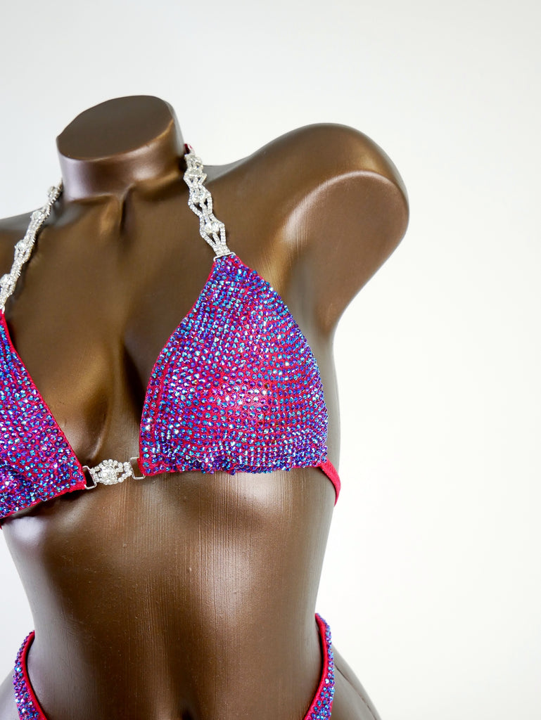 This bikini is designed using hot press czech rhinestones, applied at once to create affordable bikinis.