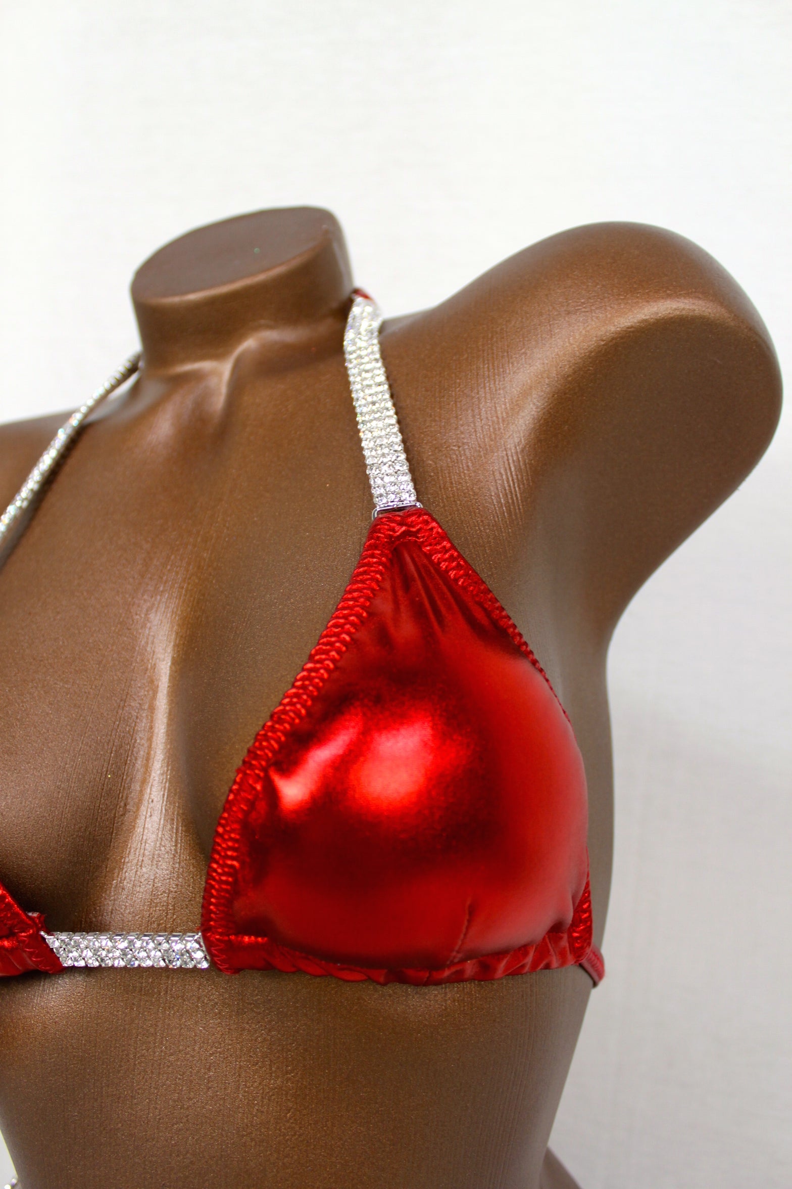 - Features: Triple closeup crystal clear rhinestone connectors at the bra, 4- line hanging crystal clear connectors at the hips, scrunch back, small rio back coverage