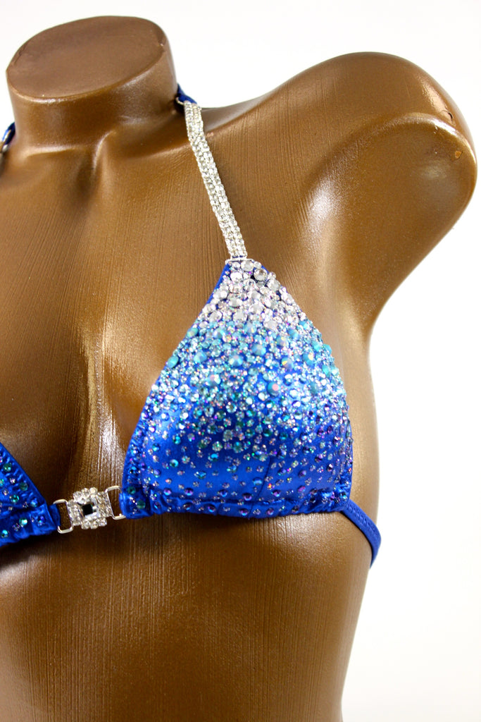 - Features: Double close up crystal clear rhinestone connectors at hips & bra, rhinestone square center connector, decorated with crystal clear, light blue & bermuda blue rhinestones, sparkling glitter detail, scrunch back, rio back coverage