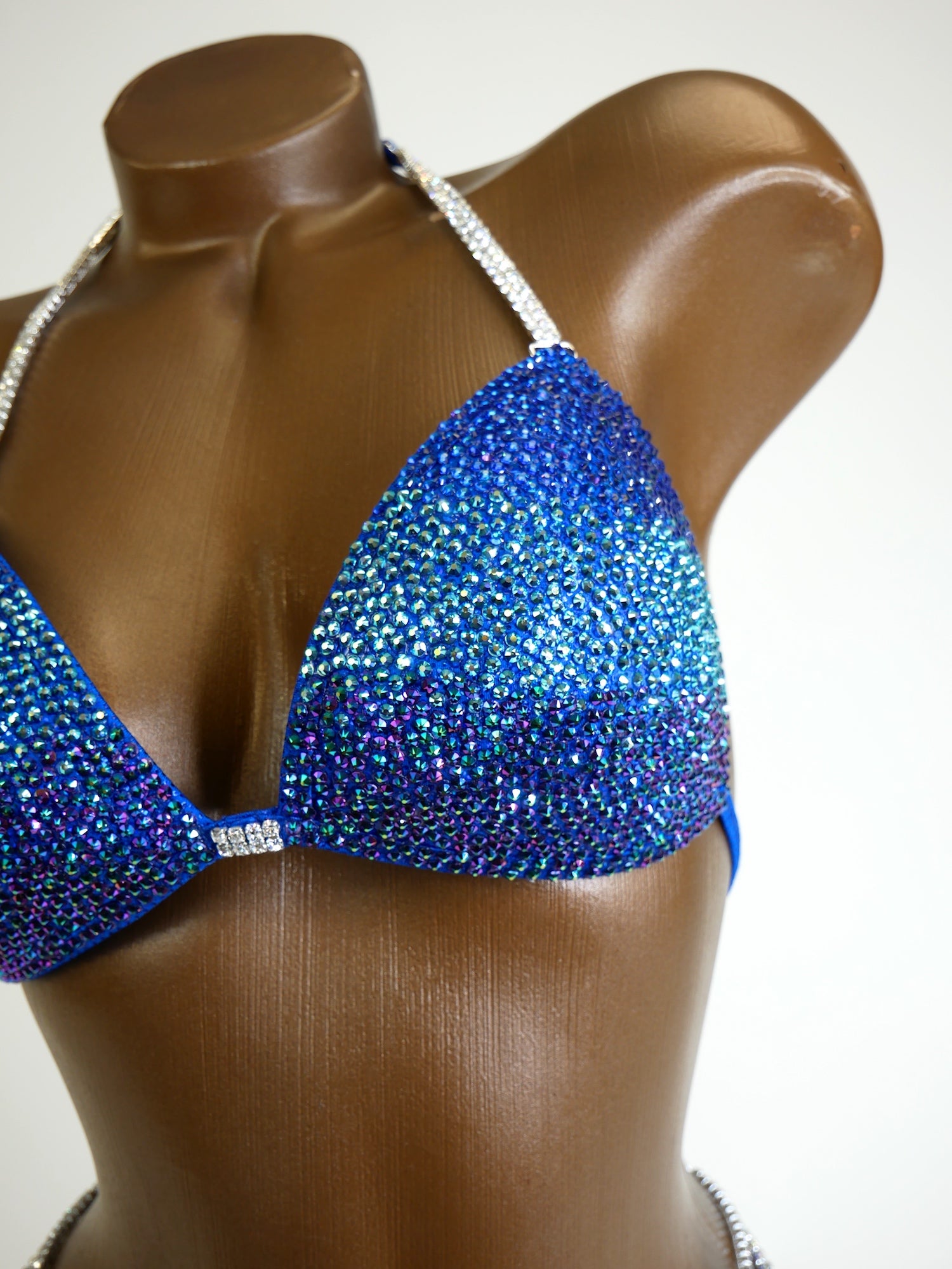- Features: Double close up crystal clear rhinestone connector at bra, Close up triple hanging rhinestone connector at hips, decorated with capri, sapphire & scarabeus AB rhinestones, scrunch back, Rio Pro Cut back coverage