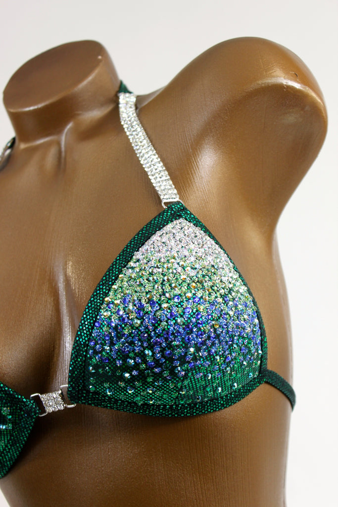 - Features: Triple close up crystal clear rhinestone connectors at hips & bra, decorated with crystal clear, peridot AB, sapphire & emerald AB rhinestones, scrunch back, pro cut rio back coverage